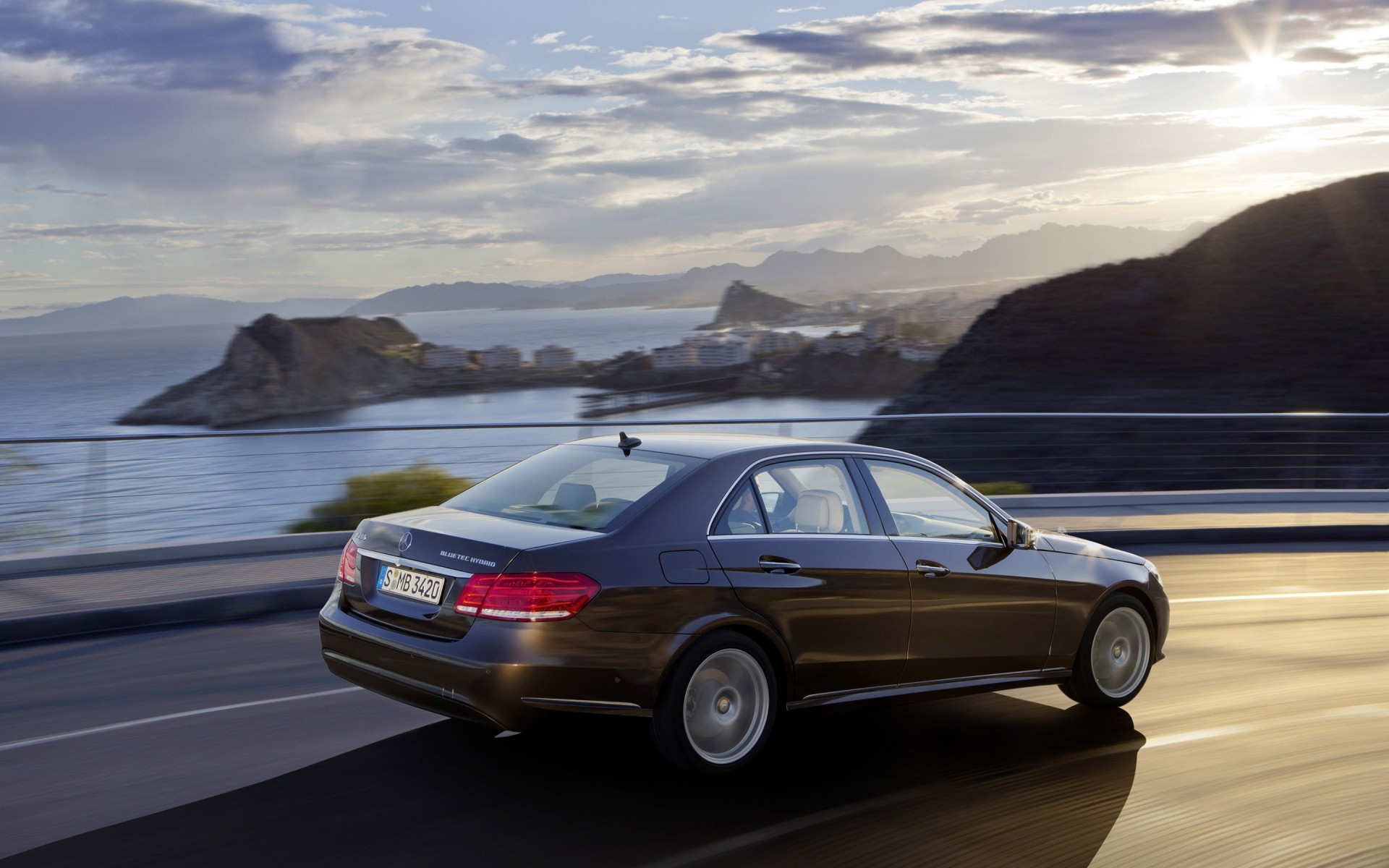 Mercedes benz viaja ao longo das montanhas e da águaMercedes Benz viaja ao longo das montanhas e da água