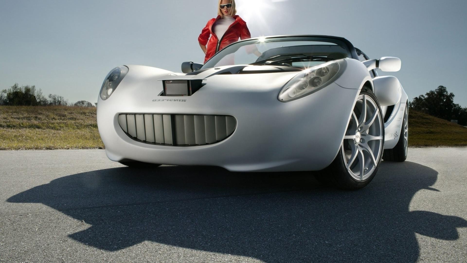 Foto de uma mulher no fundo de um carro esportivo elegante