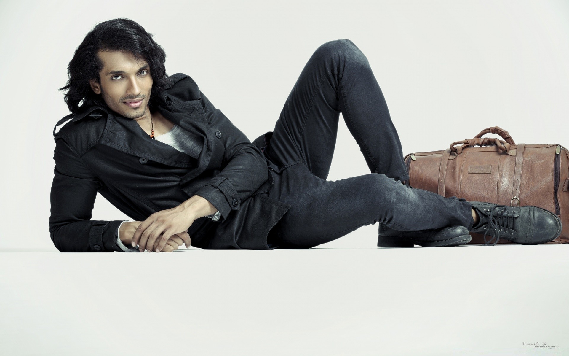 O modelo está deitado e posando para si mesmo