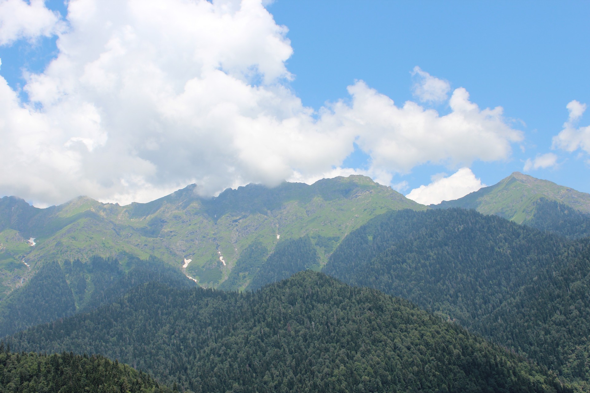 Casas nas montanhas verdes sob o céu azul aberto com nuvens
