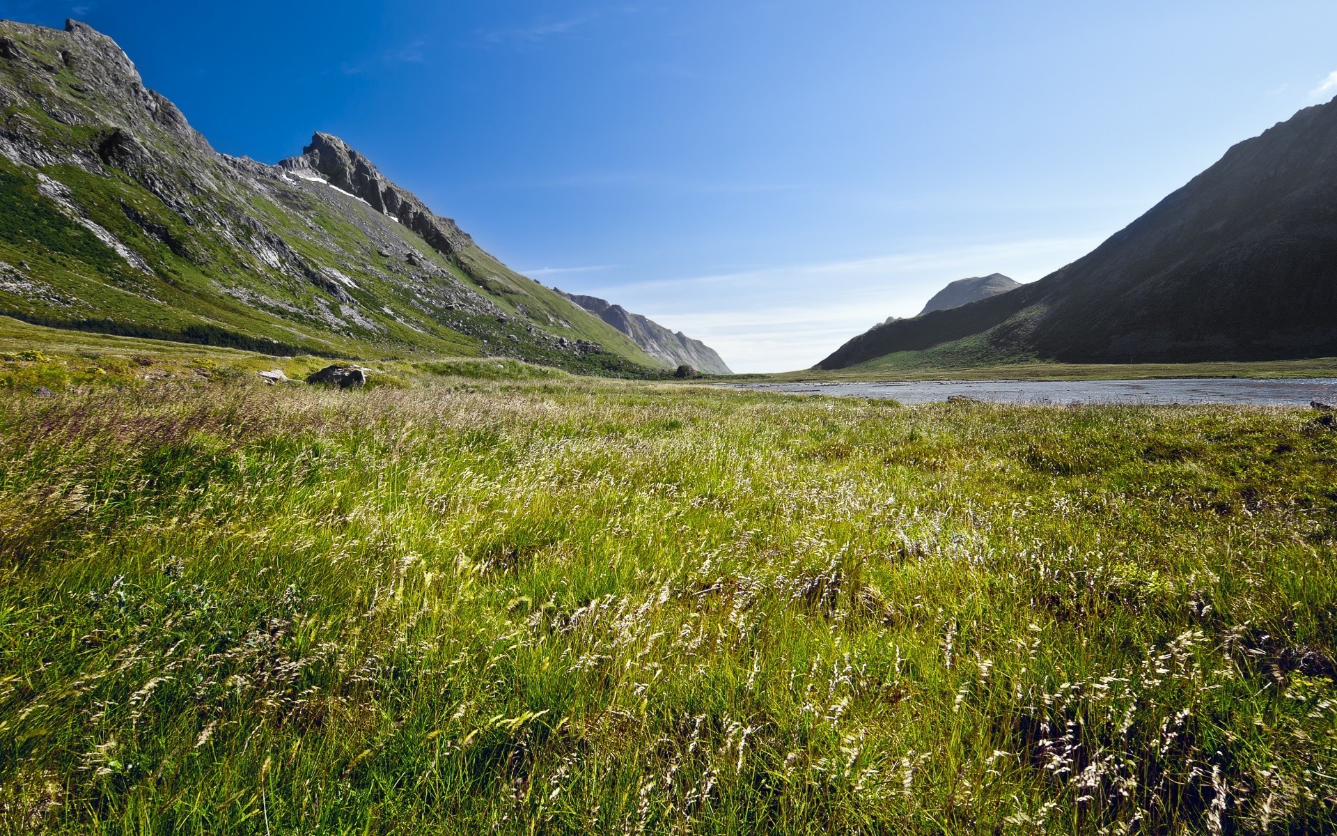 Montanhas cobertas de neve perto da água ao anoitecerMontanhas cobertas de neve perto da água ao anoitecer