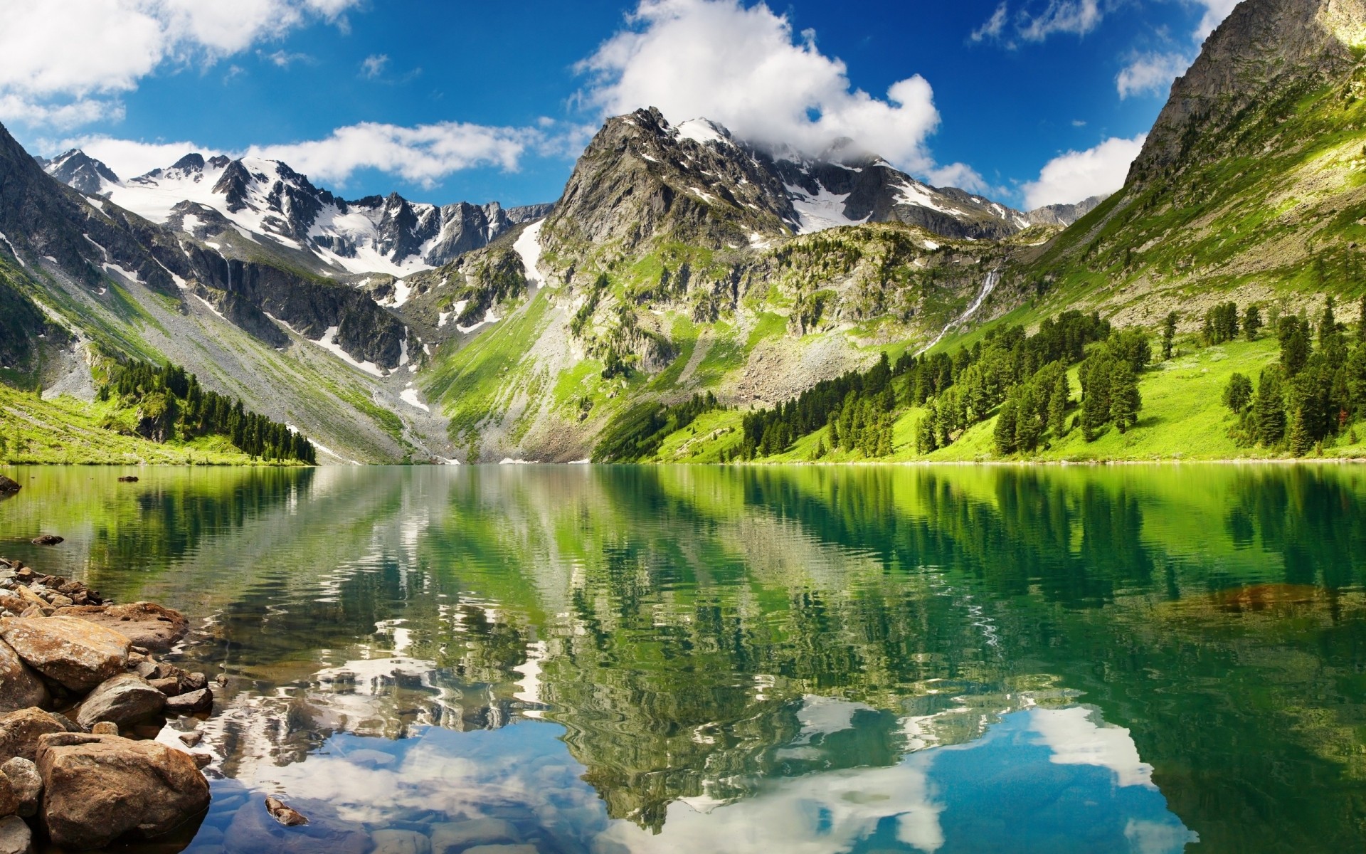 Montanha. Viagens e montanhas. Reflexo na água. Montanhas na neve