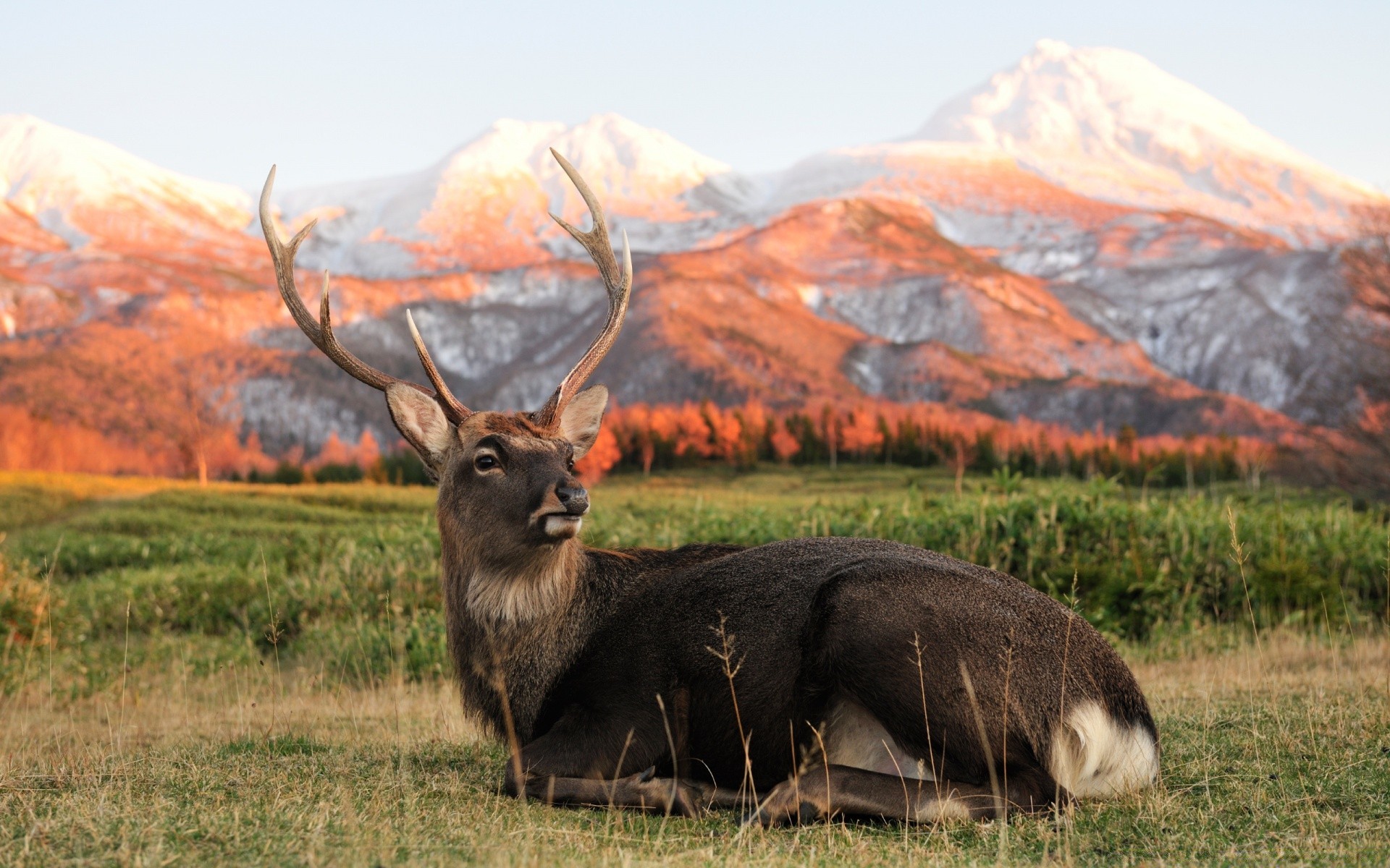 Pôr do sol sobre as montanhas, árvores poderosas, prados suculentos
