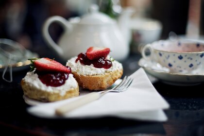 Serviço de chá. Café da manhã com morangos