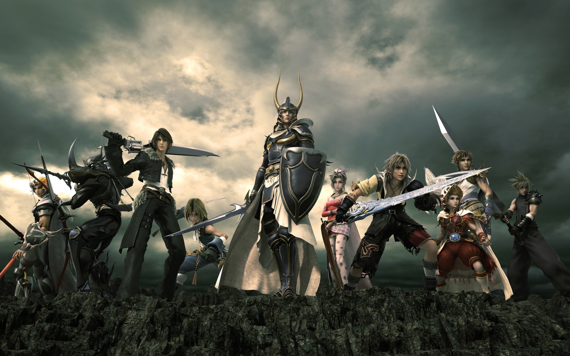 Exército armado no campo em meio à névoa de final fantasy