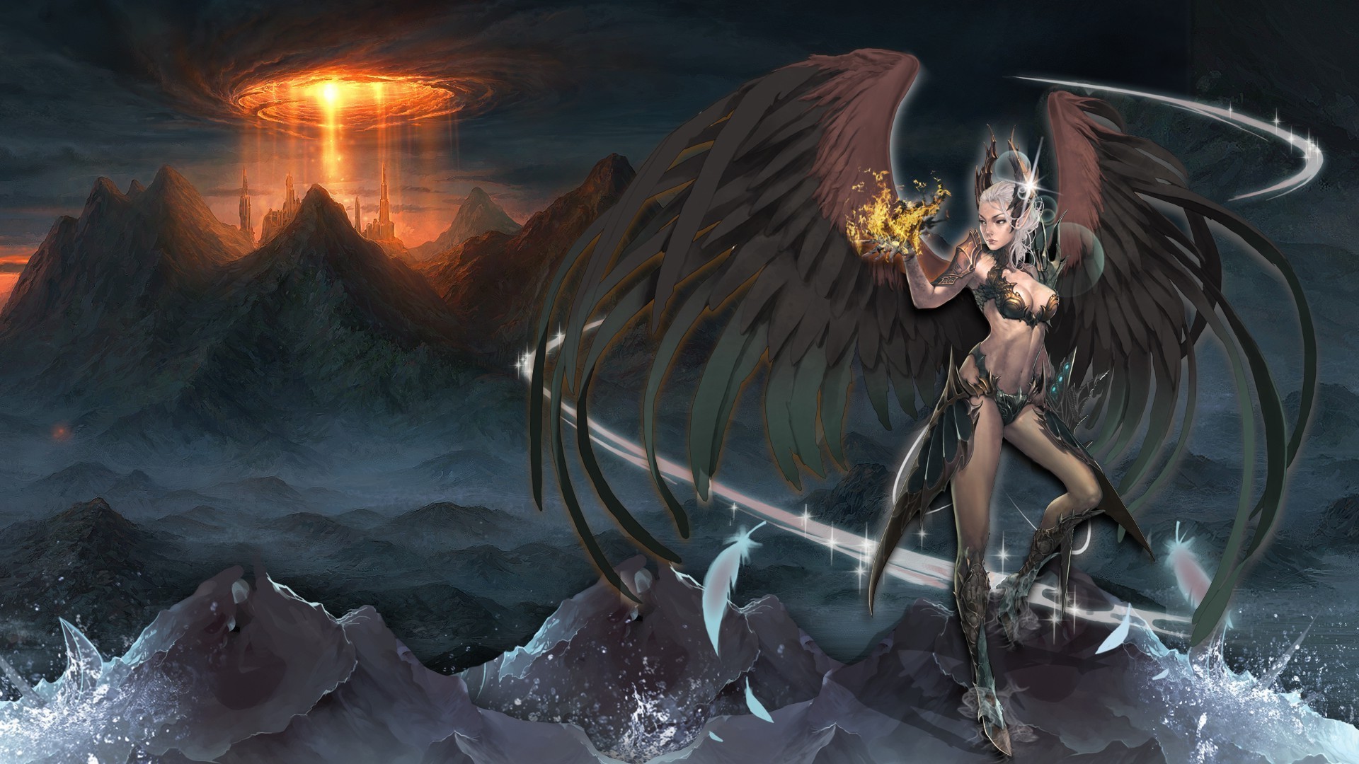Paisagem montanhosa com castelo e árvores com nuvens vermelhas no céu