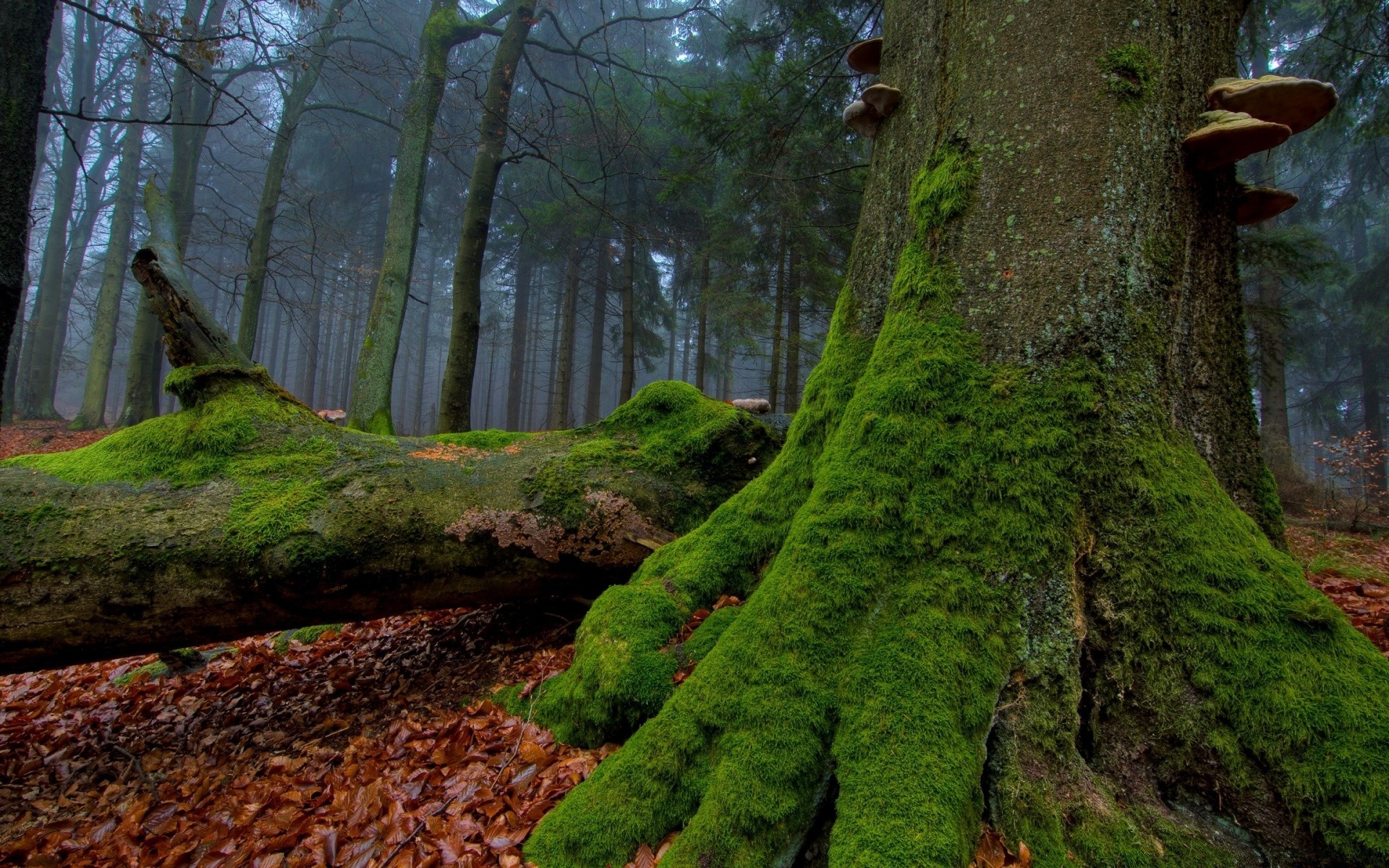 Árvores cobertas de musgo e cogumelos na floresta escura