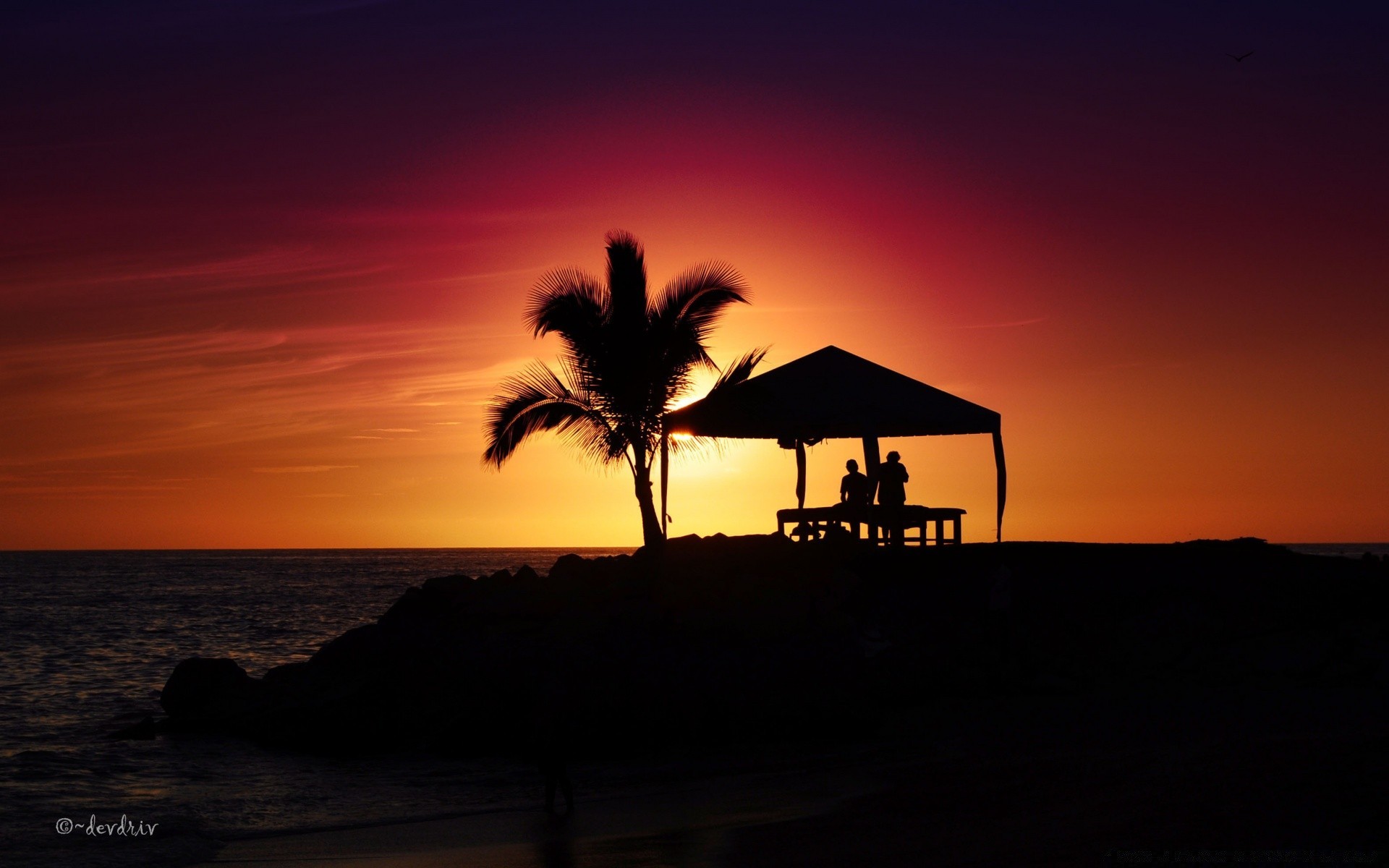 Pessoas em um gazebo na praia sob uma palmeira assistindo o pôr do sol
