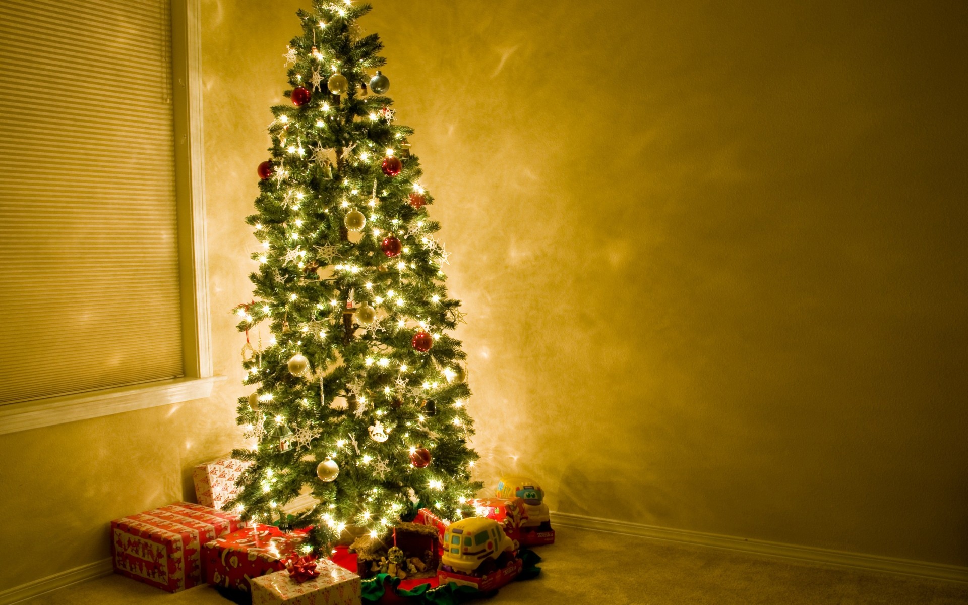 Árvore de Natal à luz das luzes guardando caixas de presentes