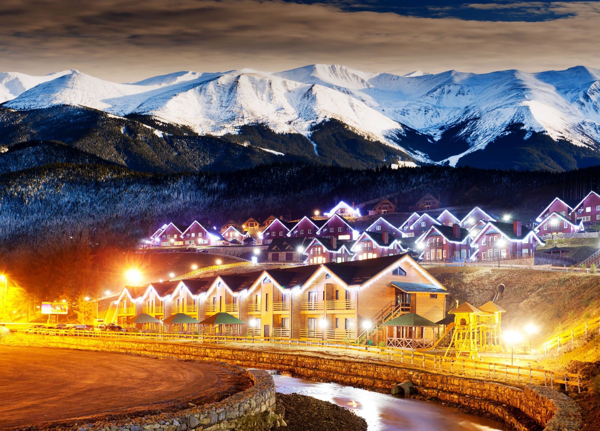 Casas aconchegantes no fundo das montanhas cobertas de neve