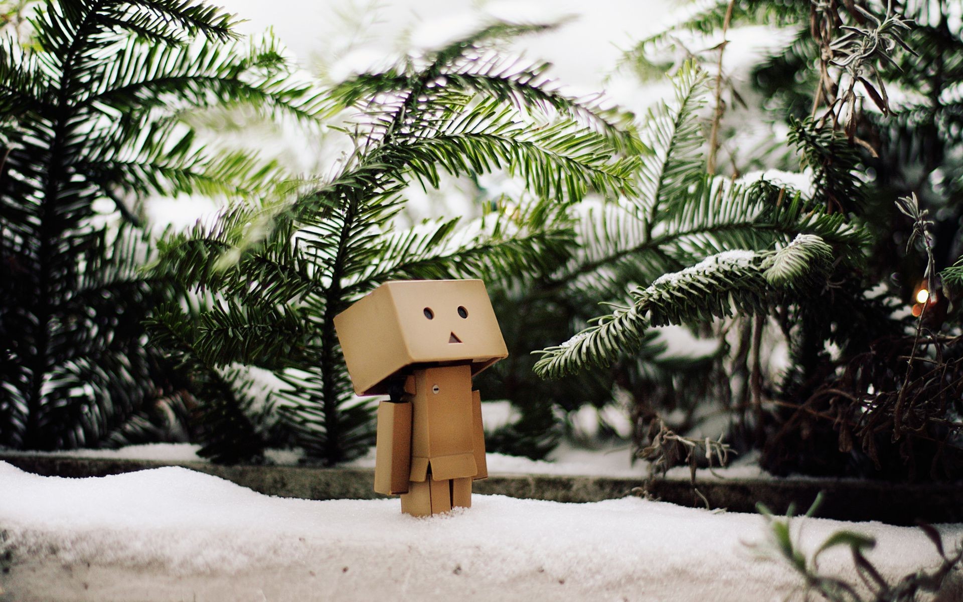 Robô feito de caixas de papelão fica na neve entre ramos de abeto