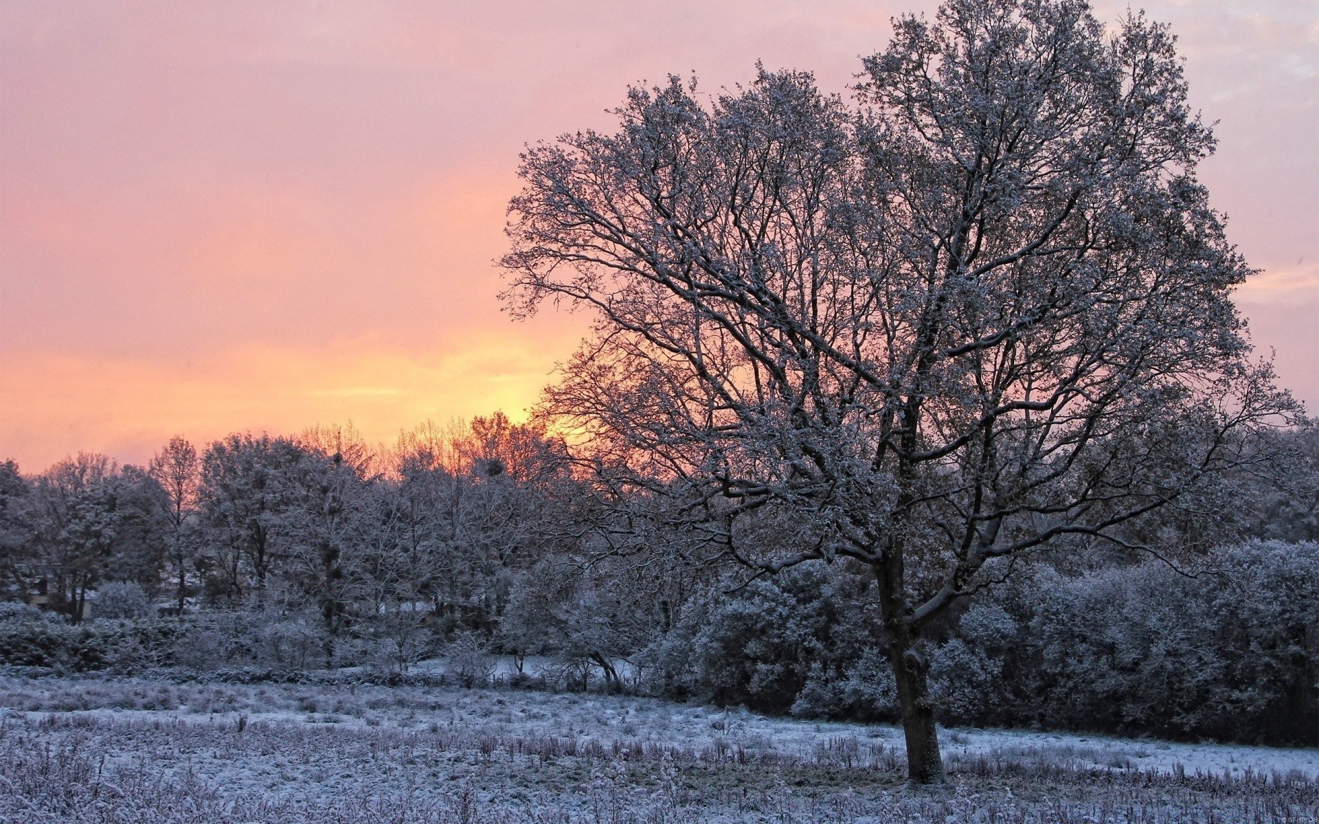 Pôr do sol de Inverno e uma árvore na neve