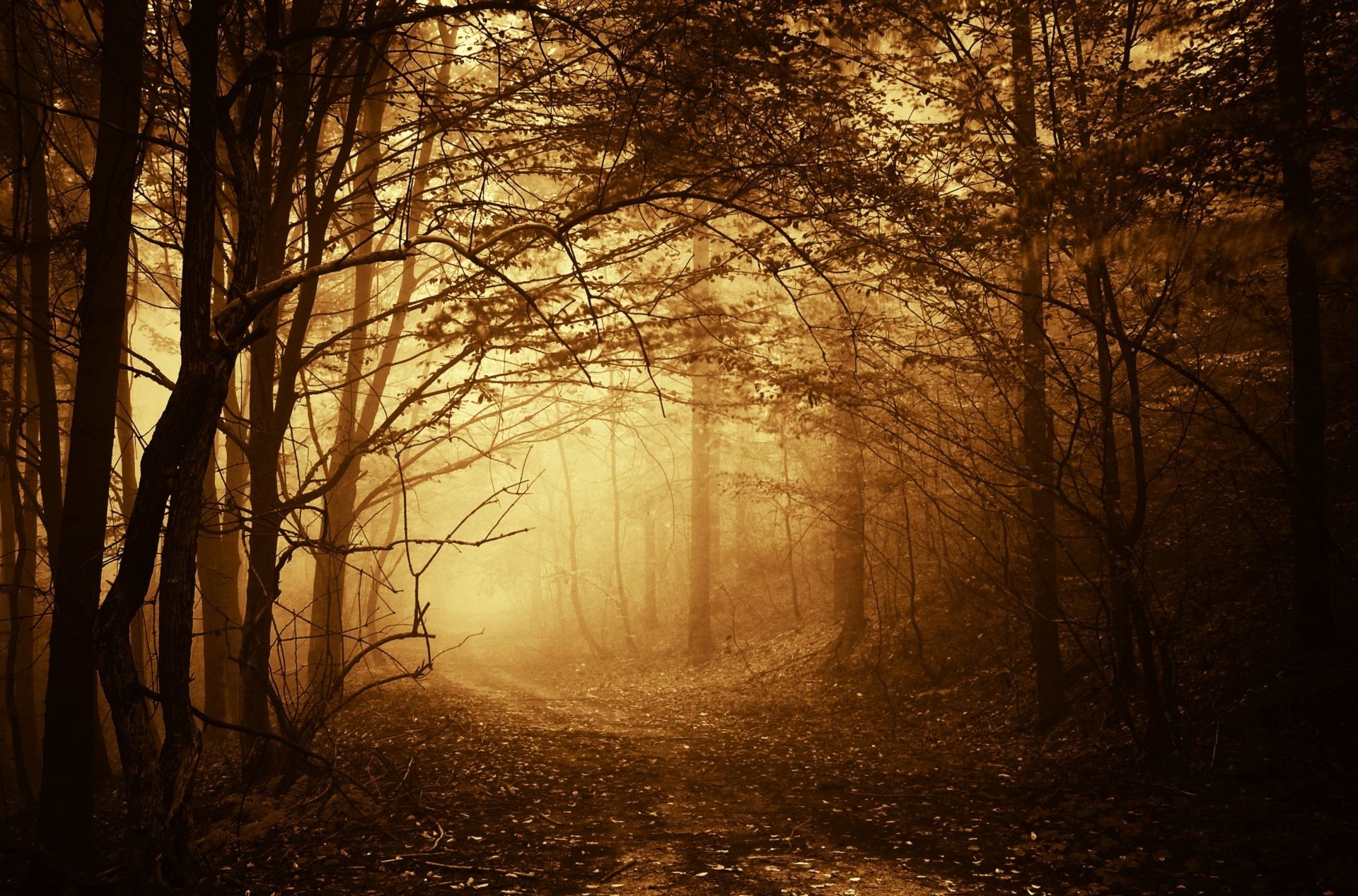 Floresta de outono e árvores no nevoeiro