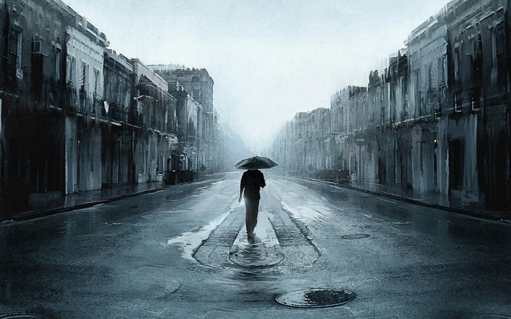 A estrada na chuva é deserta, apenas um guarda-chuva como um telhado contra o mau tempo