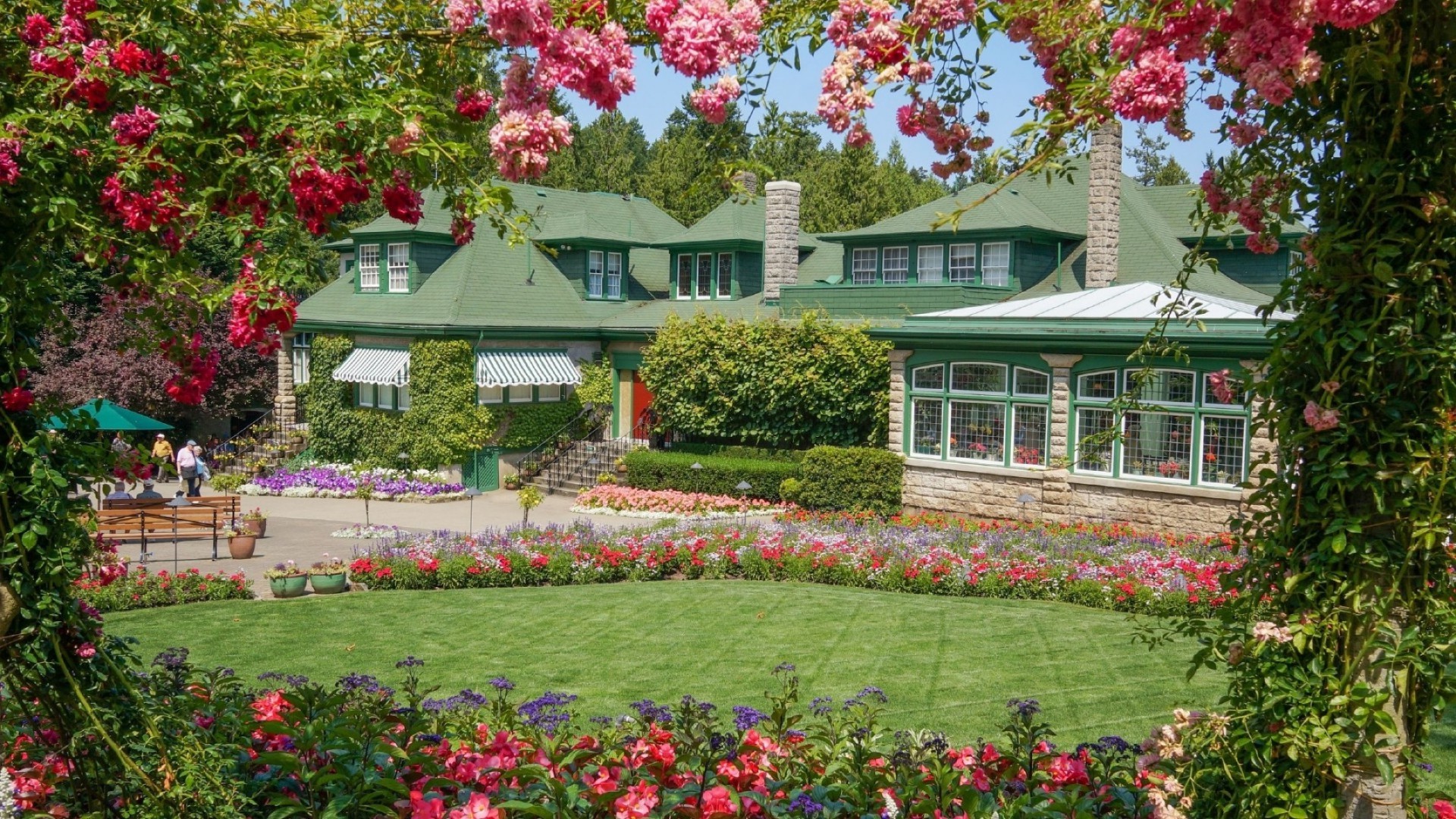 Casas e chalés no jardim de flores