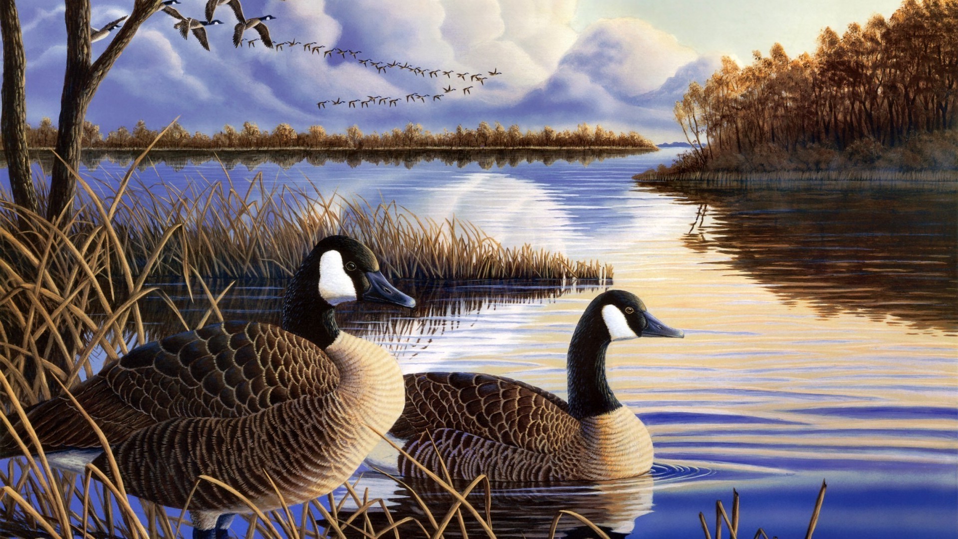 Fundo calmo, lago dois patos no fundo da floresta
