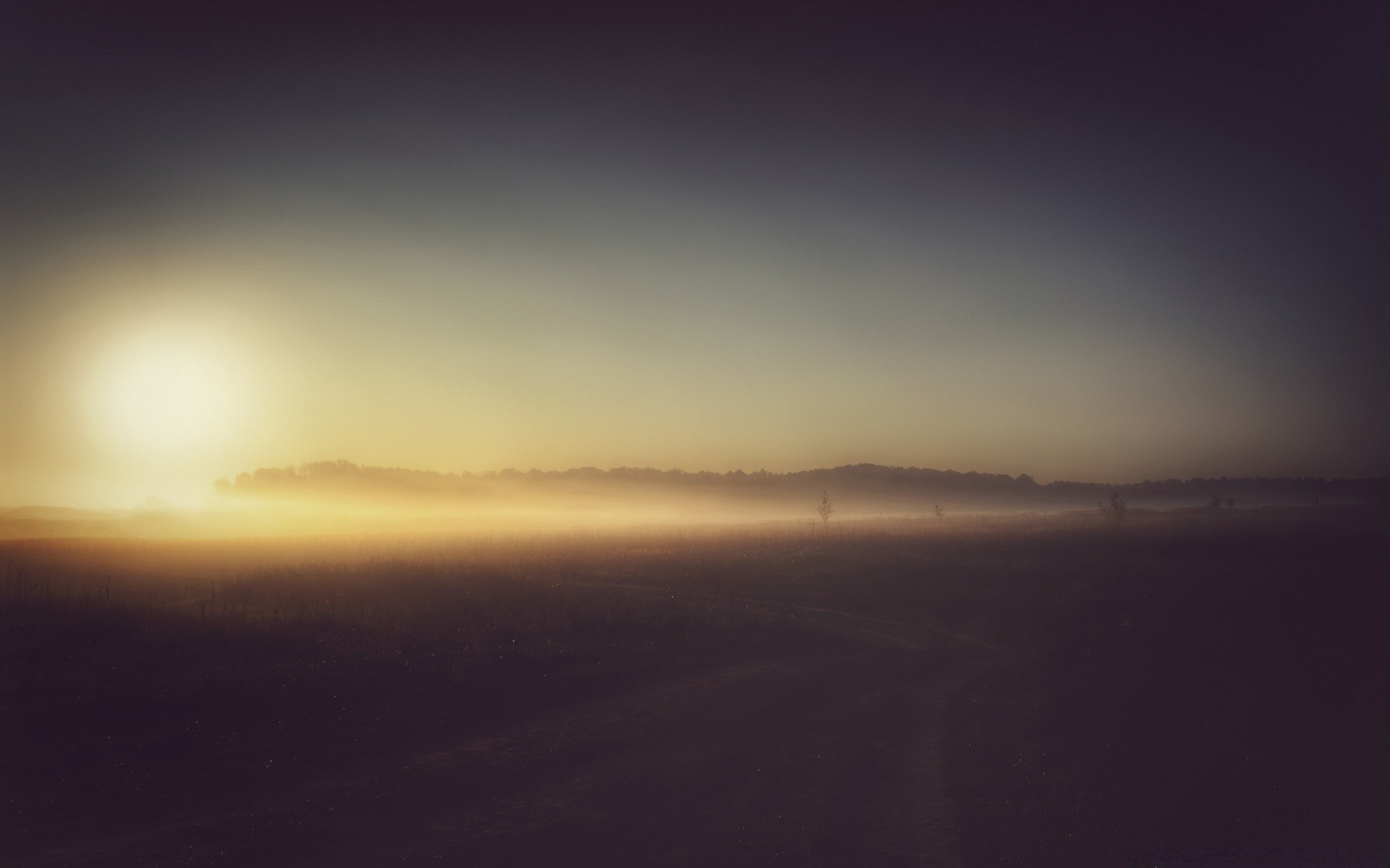 Pôr do sol da noite em um campo nebuloso