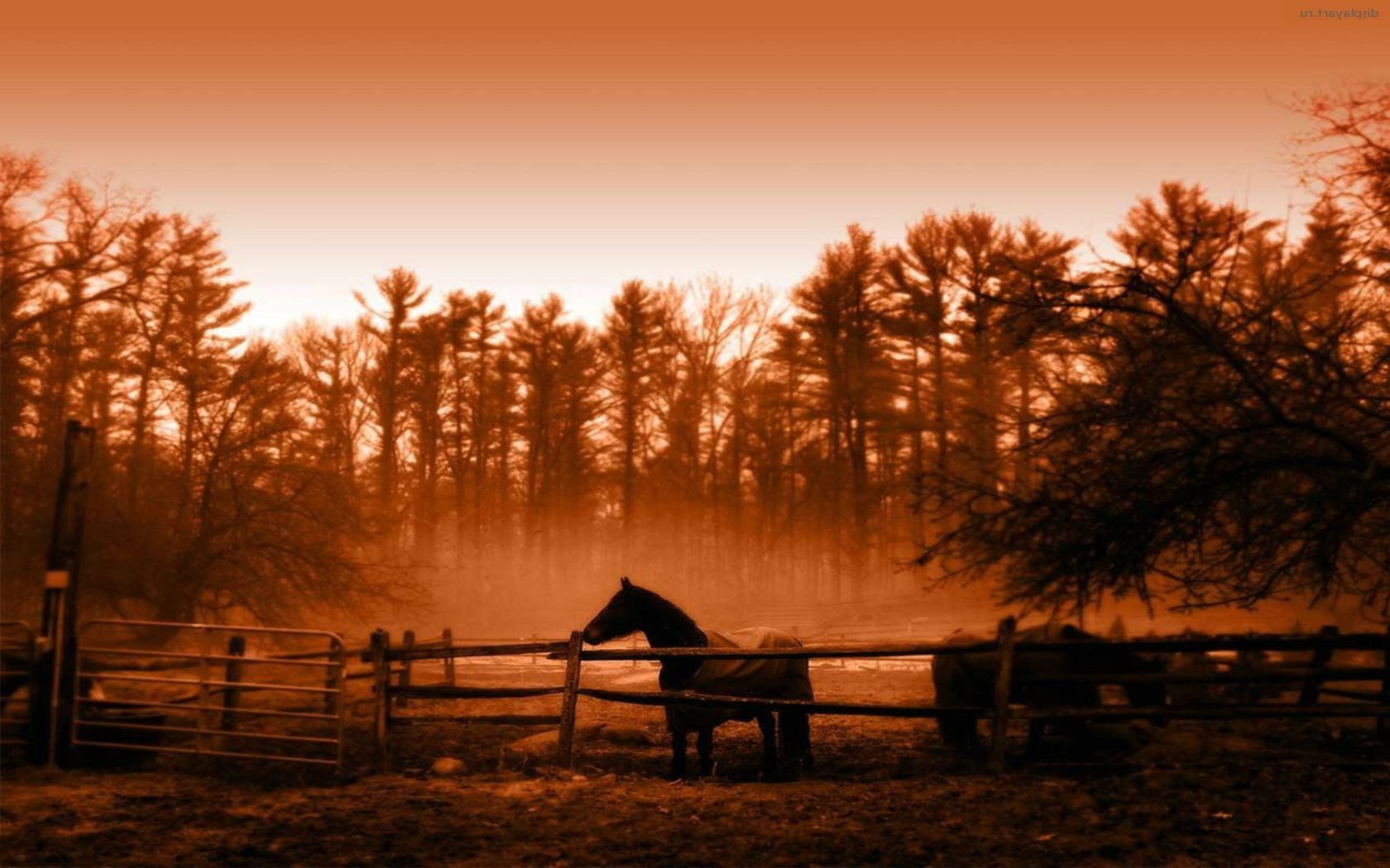 Cavalos andando ao pôr do sol perto das árvores