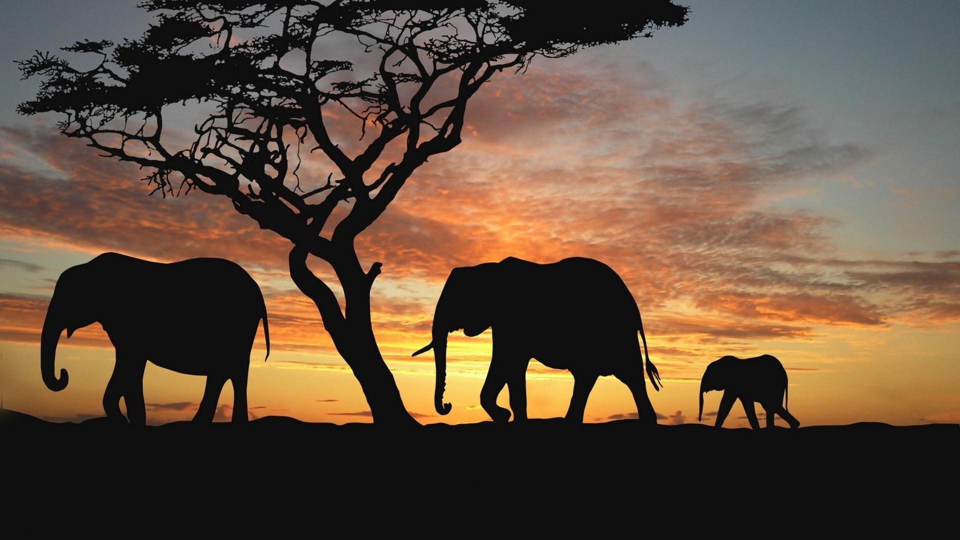 Silhuetas de uma família de três elefantes ao pôr do sol