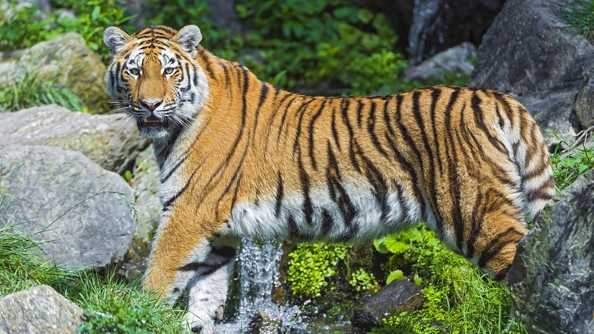 Tigre perto de pedras no fundo da grama