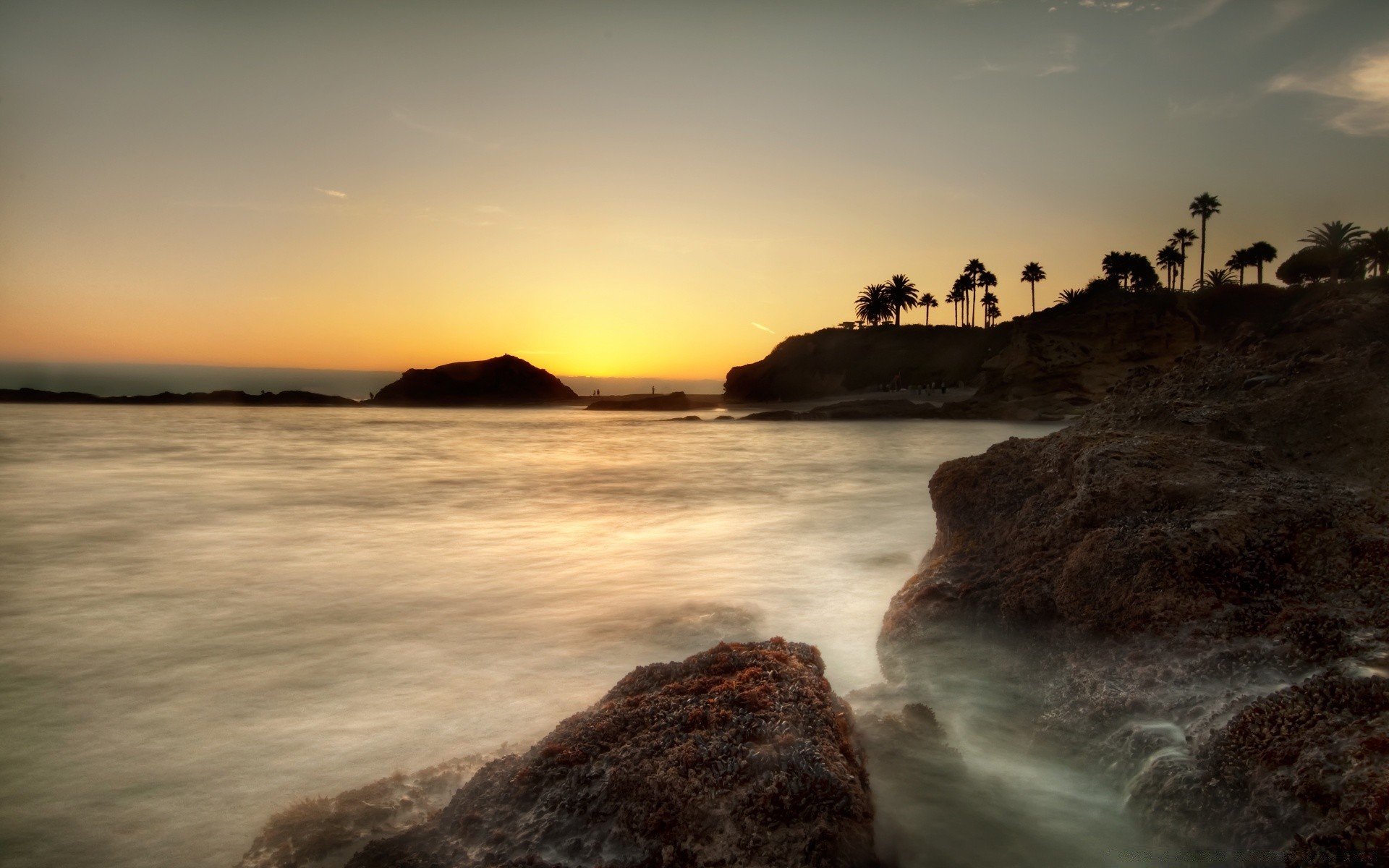 Pôr do sol no oceano no nevoeiro