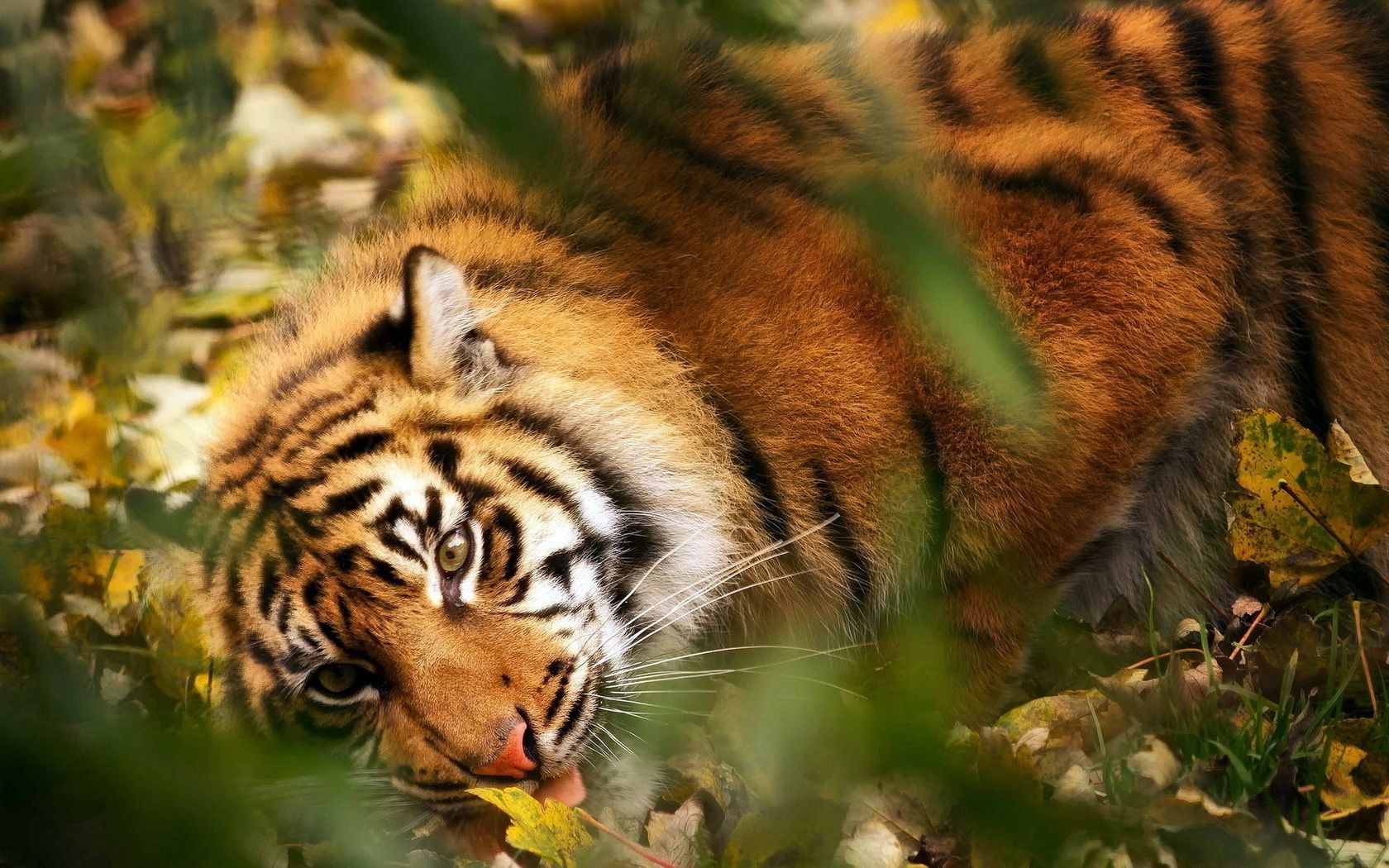 Tigres de olhos azuis deitado na grama