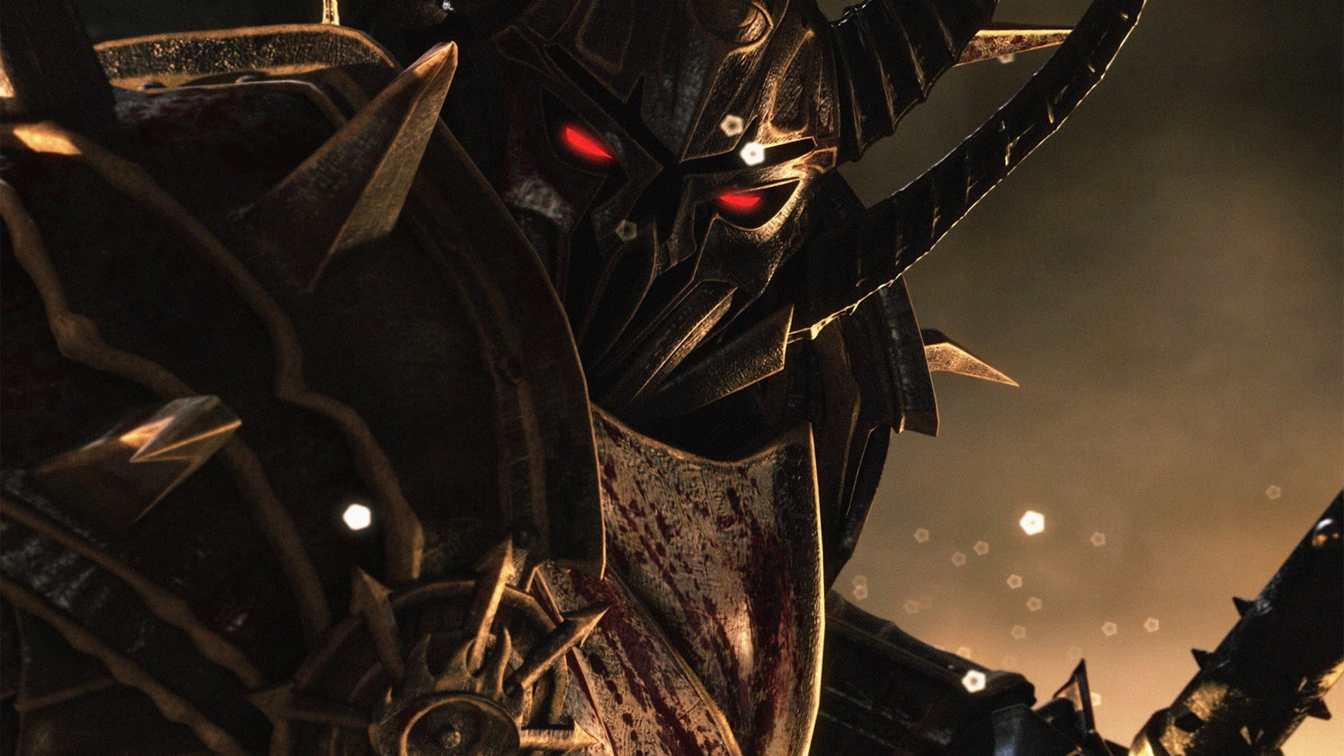 Uma criatura maligna com uma armadura de olhos vermelhos