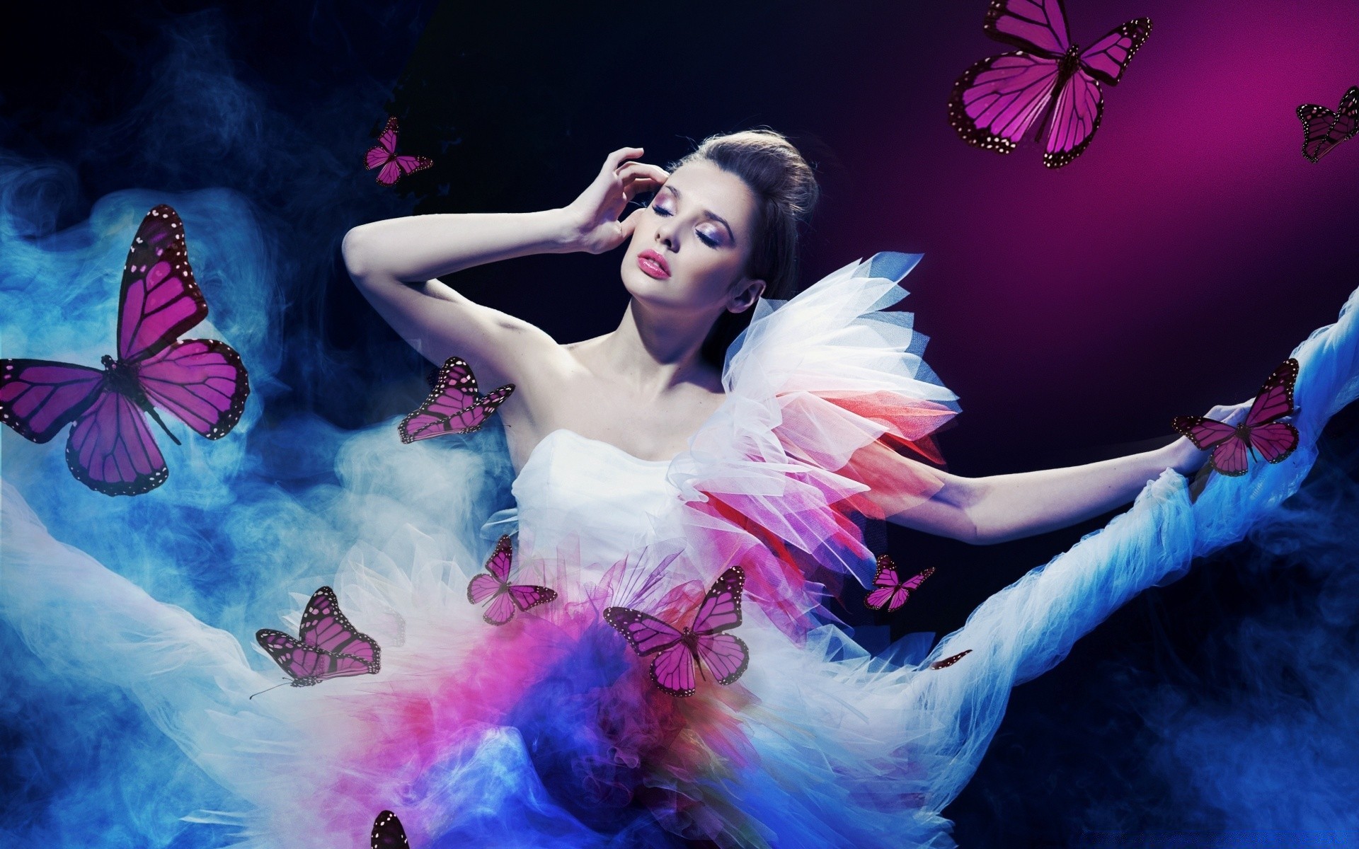 Meninas de olhos fechados cercadas por borboletas cor-de-rosa