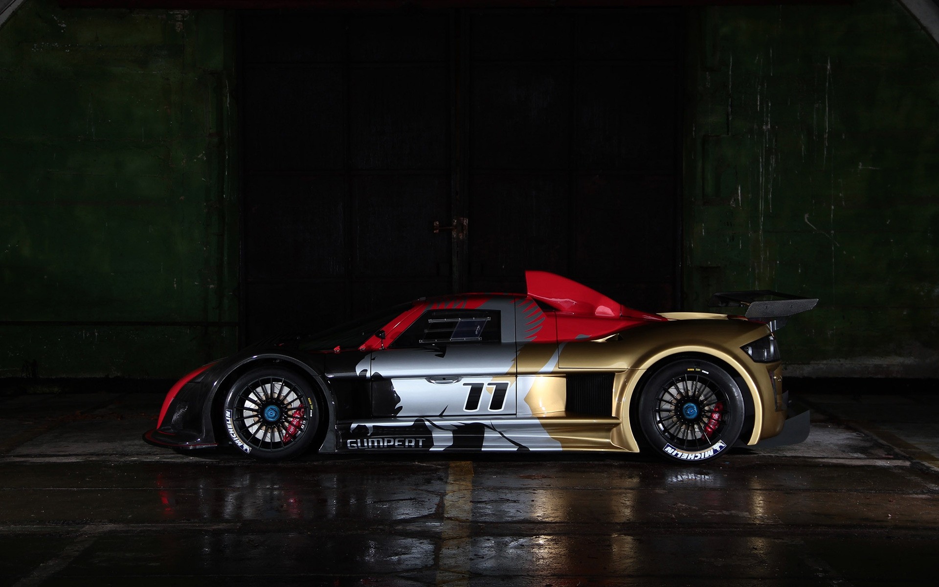 Carro esportivo, reflexo no asfalto molhado