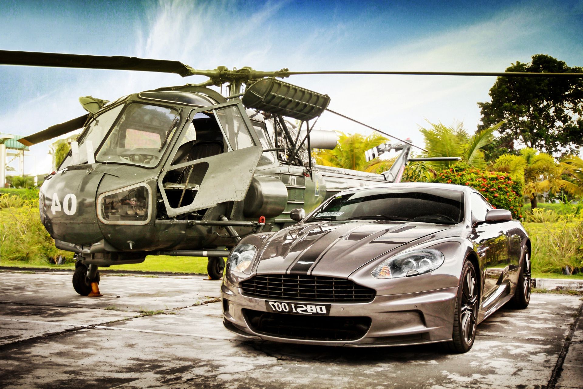 Um helicóptero e um carro no estacionamento, atrás deles árvores e grama
