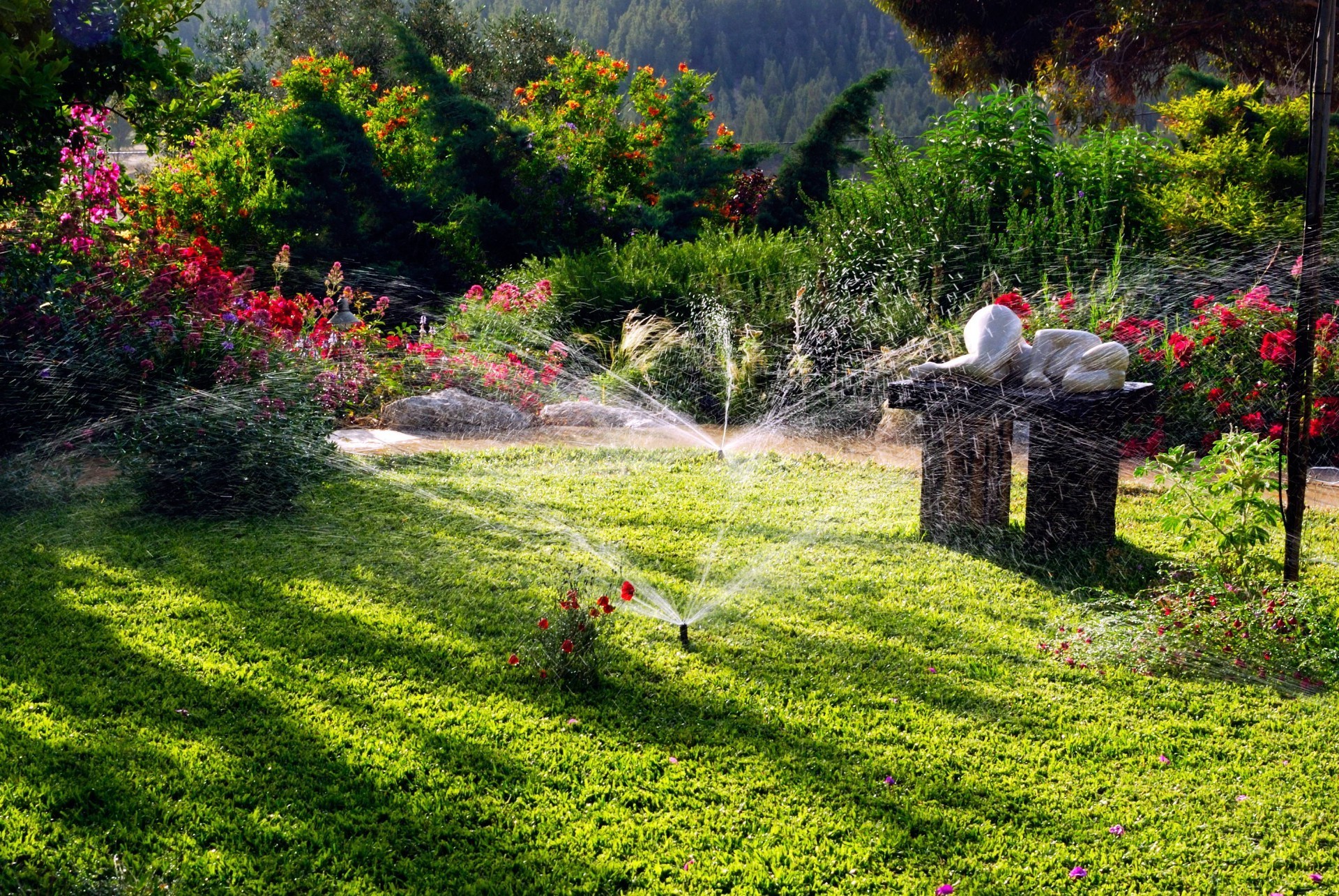 Salpicos de água em um belo jardim com flores brilhantes