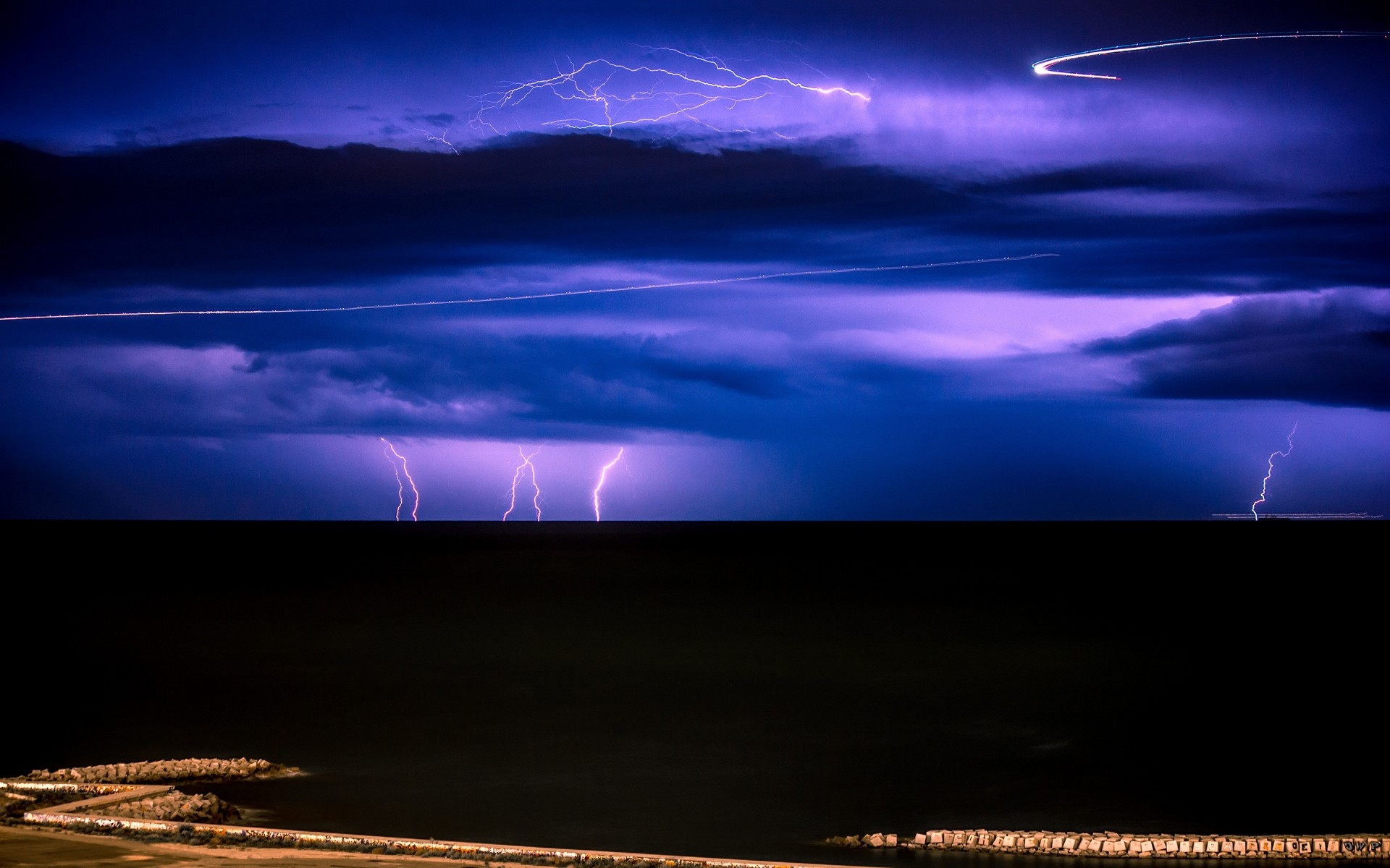 Uma bela paisagem com um céu que tem um pôr do sol e um oceanoUma bela paisagem com um céu que tem um pôr do sol e um oceano