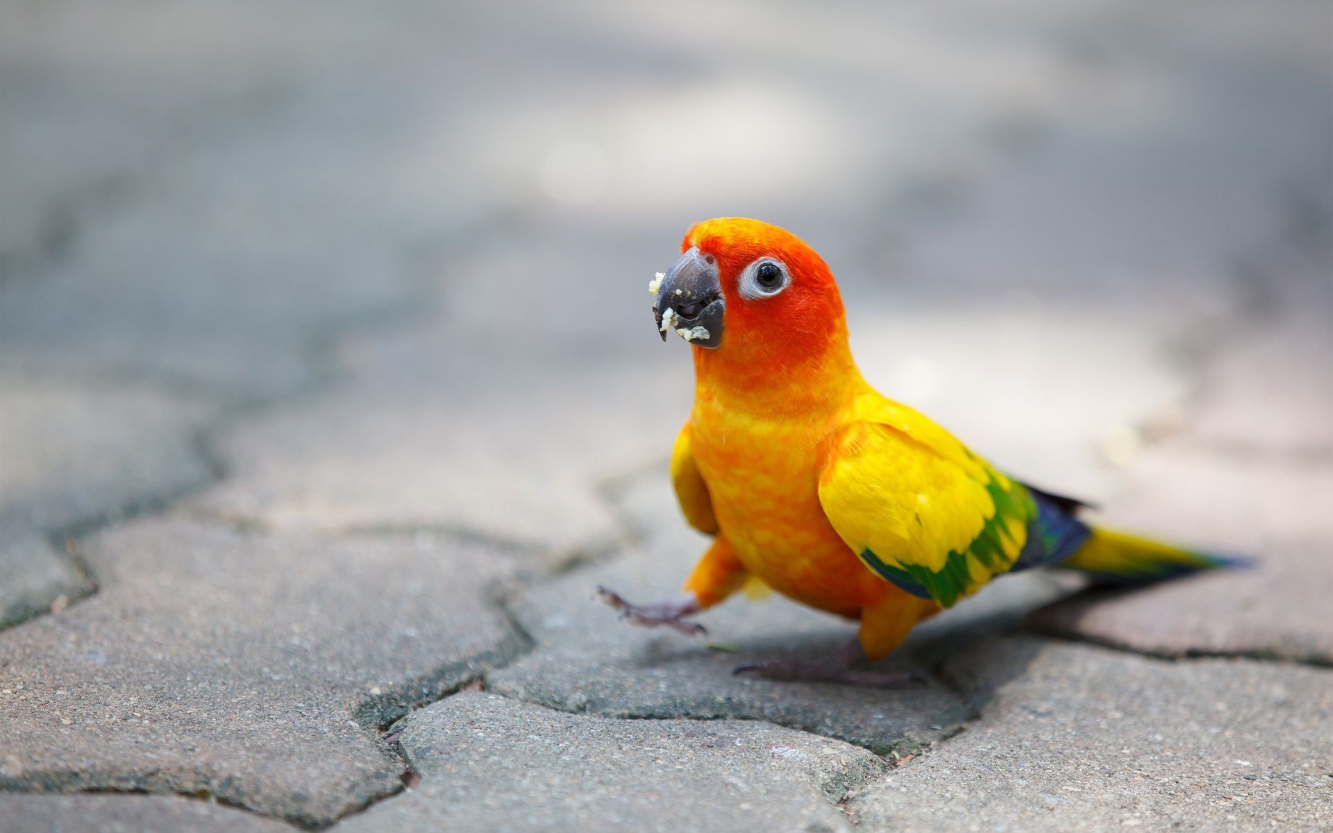 Pequeno papagaio brilhante contra um fundo de azulejo cinza