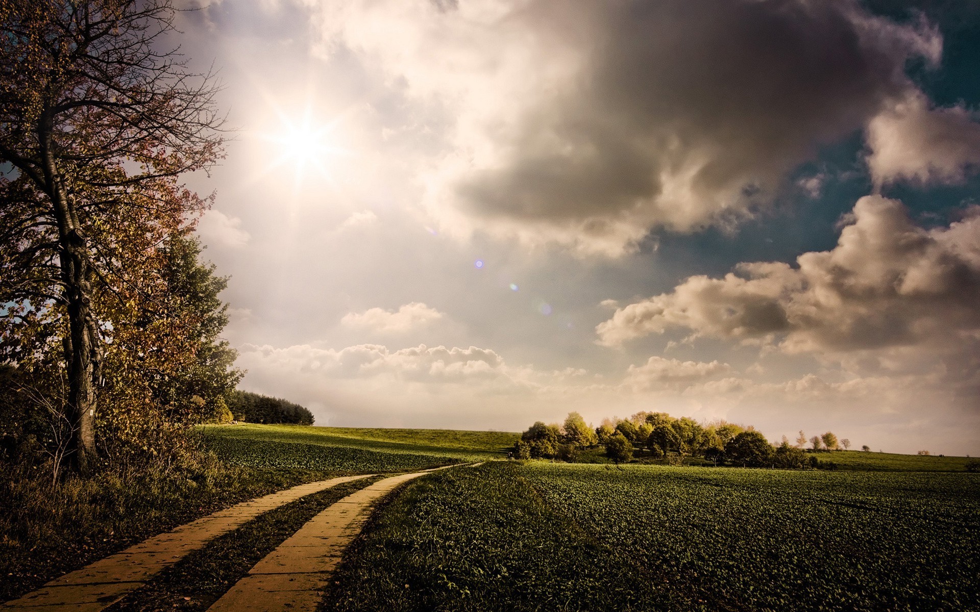 A estrada através do campo de grama verde