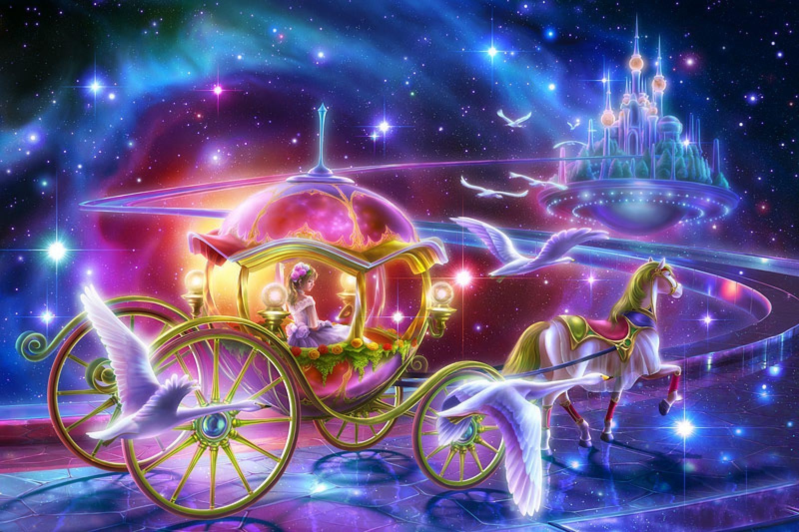 Uma carruagem mágica. Cinderela corre para o baile