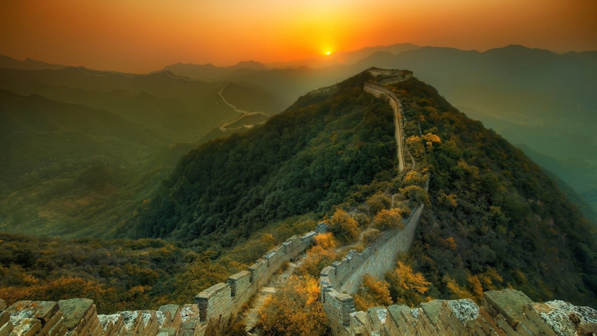 Uma colina com uma parede chinesa iluminada pelo amanhecerUma colina com uma parede chinesa iluminada pelo amanhecer