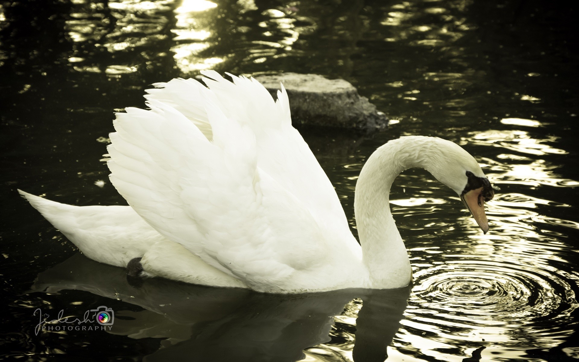 Patos no lago ao pôr do sol pode-se ver o reflexo