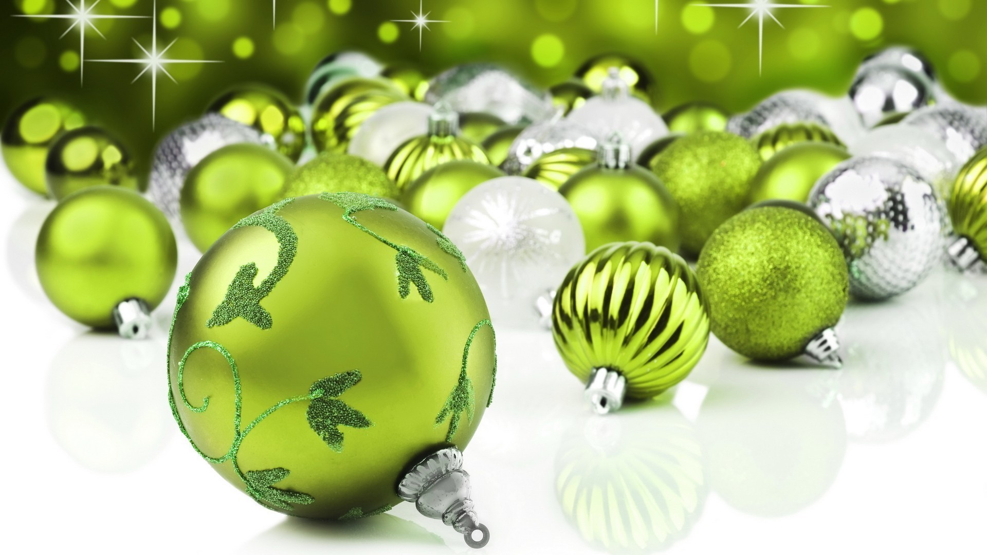 Bolas verdes e prateadas de Ano Novo em fundo branco