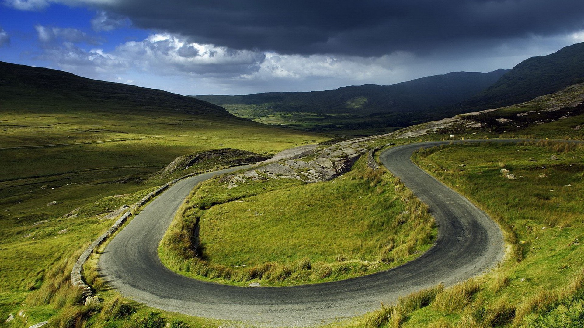 Estrada de montanha entre prados verdes