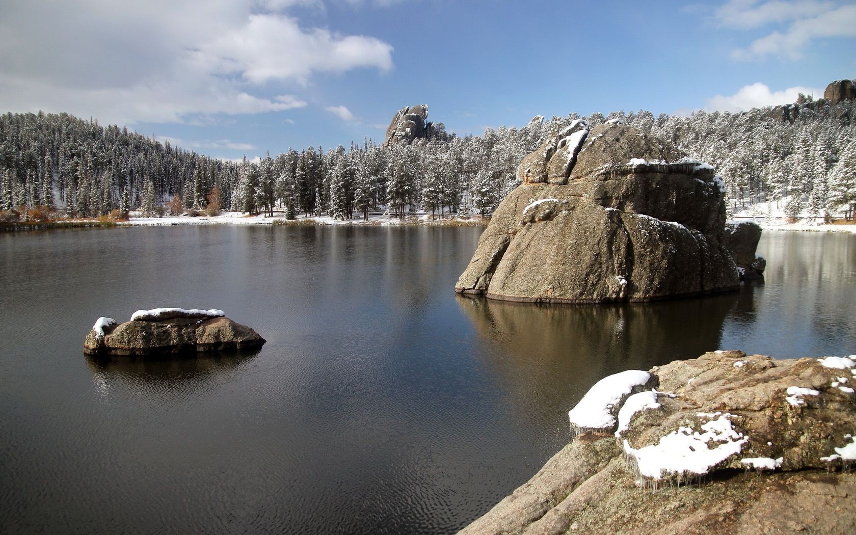 Lago incomum no inverno com pedras
