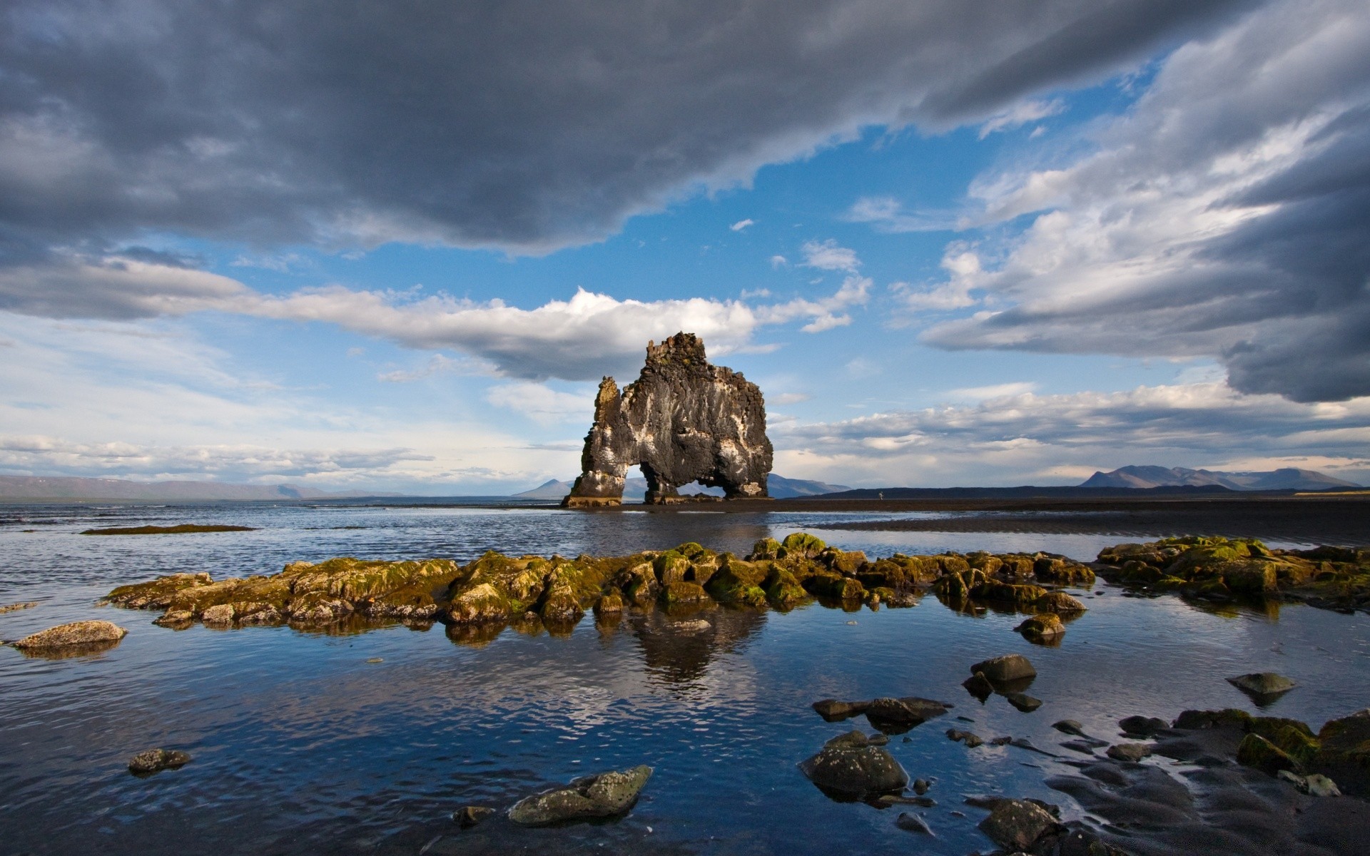 Ondas batendo nas pedras. Pôr do sol no fundo do mar