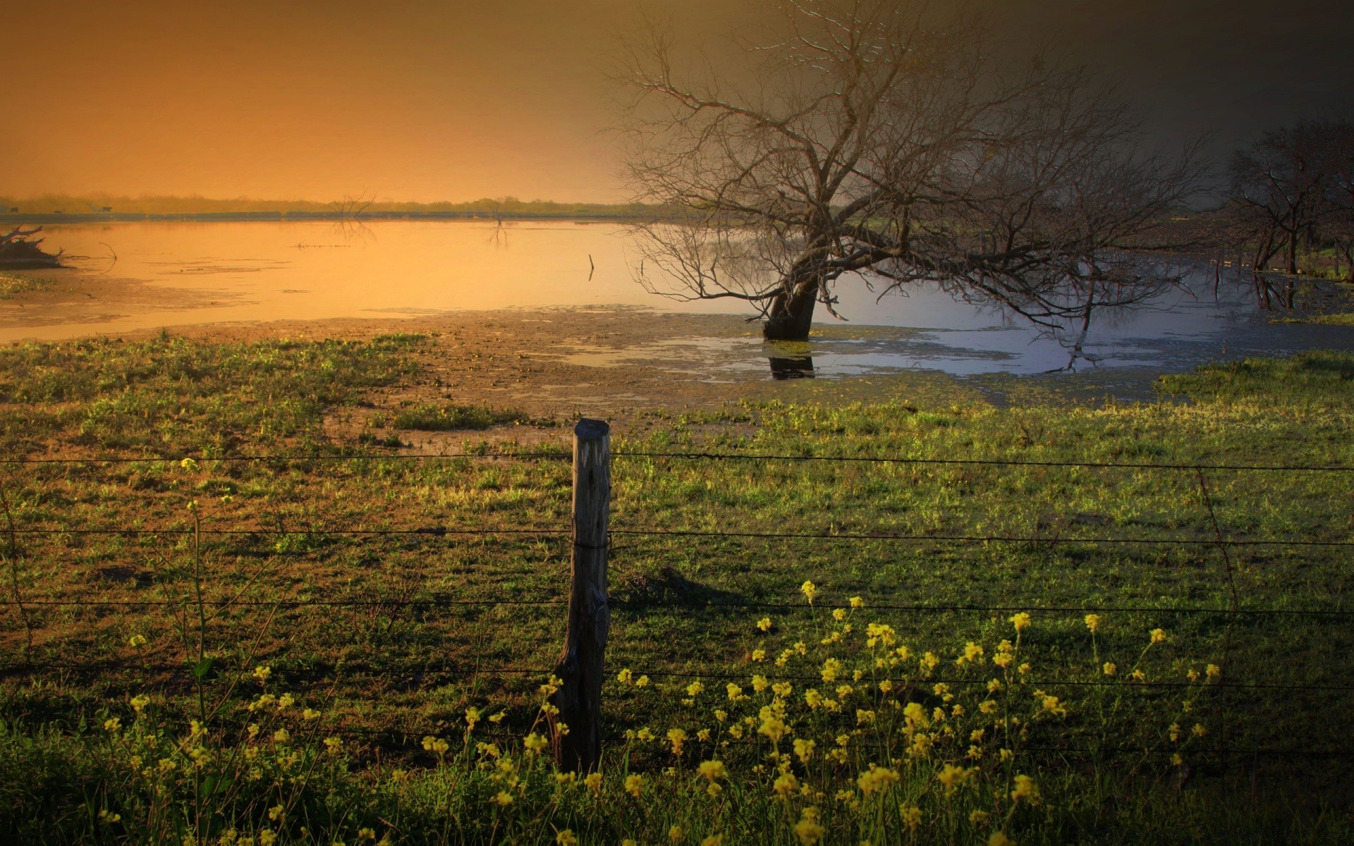Cores no campo perto da água e da árvore seca