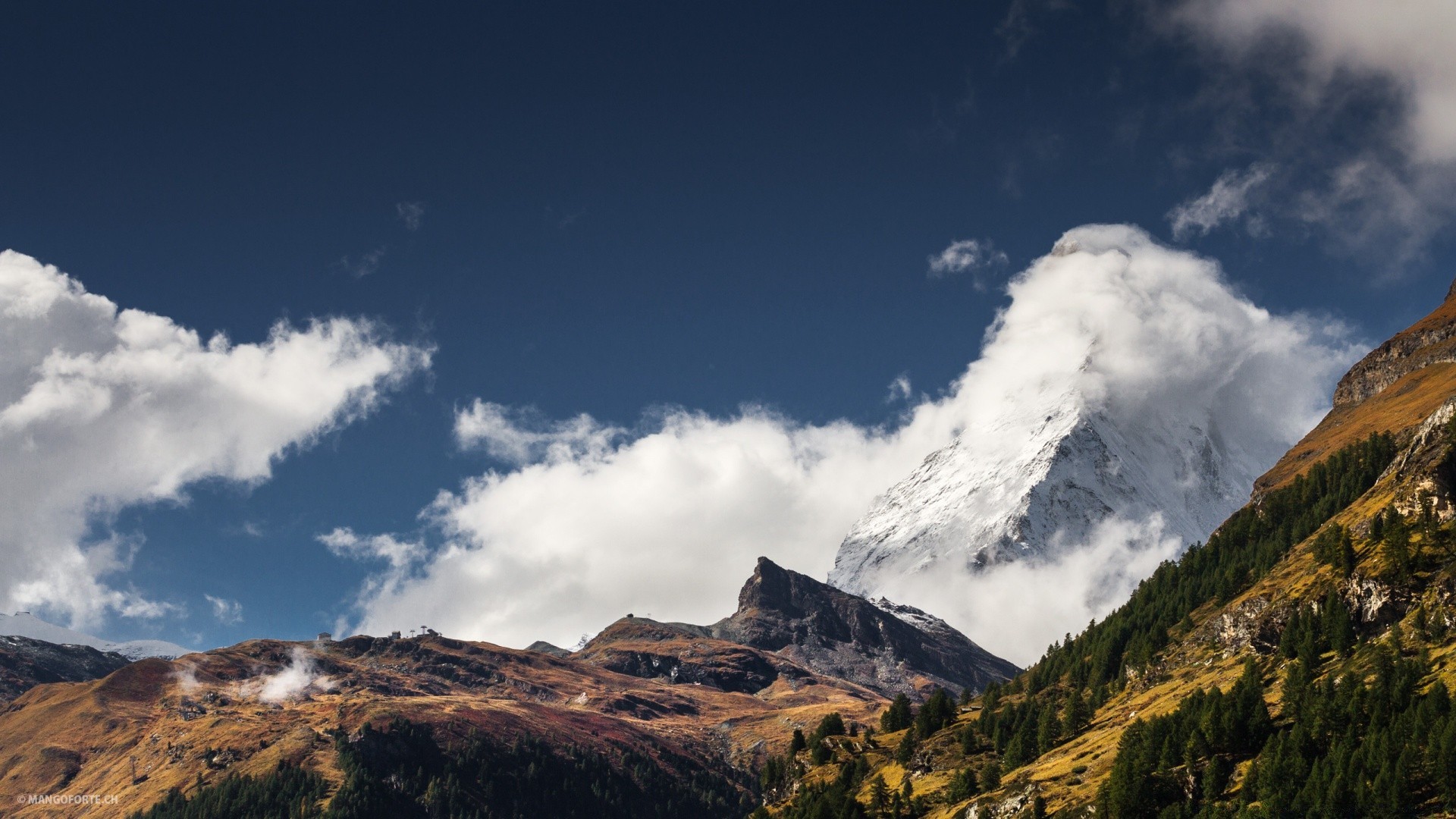 Paisagem pitoresca. Montanhas do outono e lago com floresta
