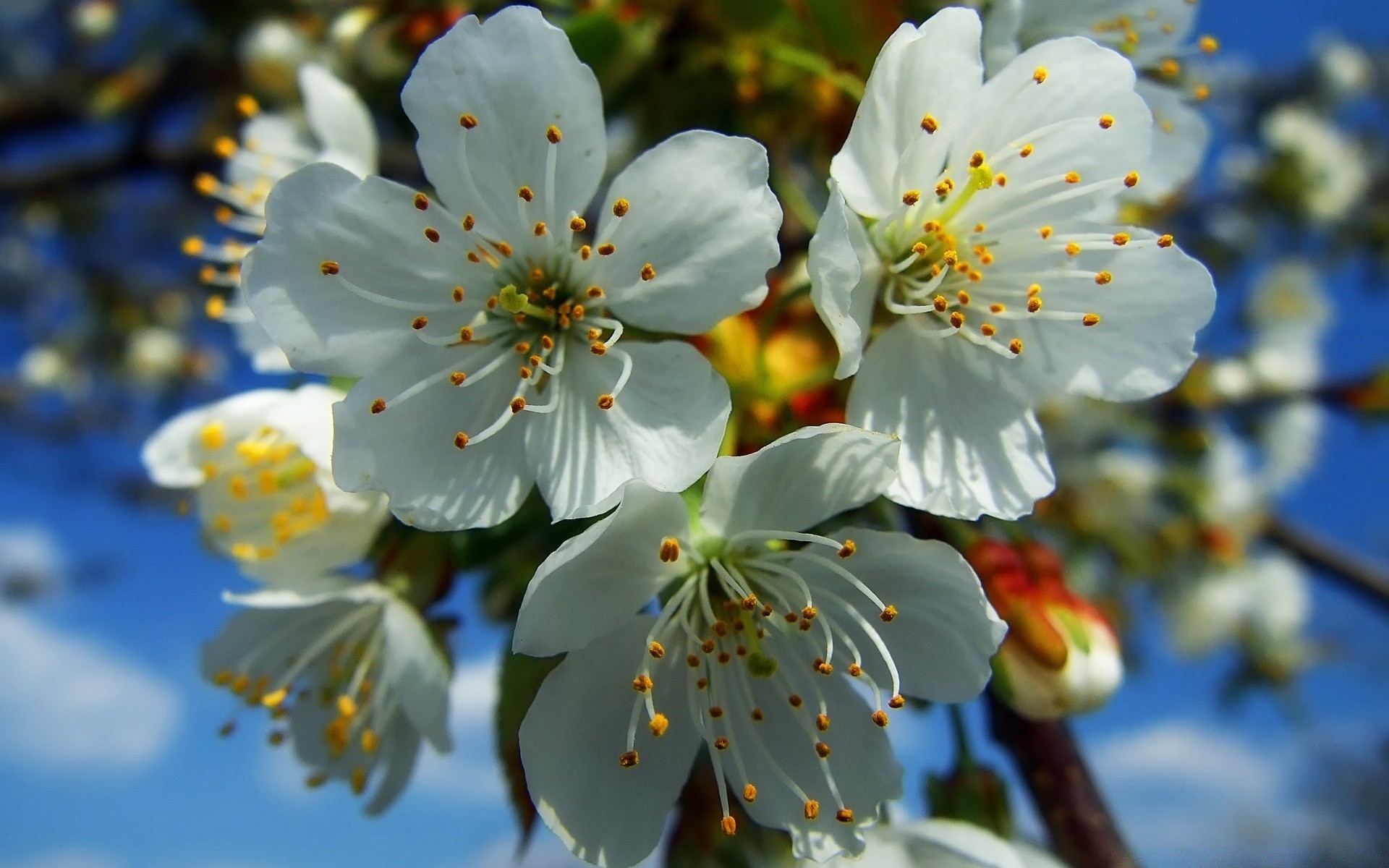 Flores brancas de cinco pétalas três flores em primeiro plano fundo desfocado no fundo céu azul com nuvens
