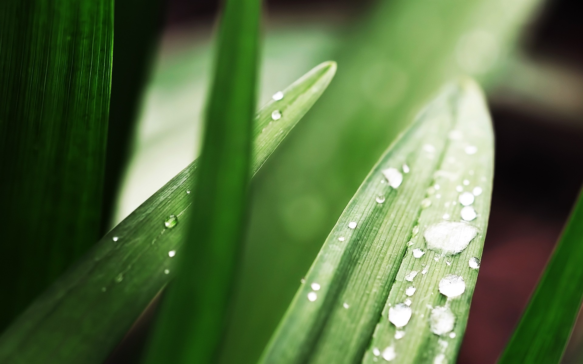 Fotografia Macro de uma folha de grama com uma pequena gota de orvalho