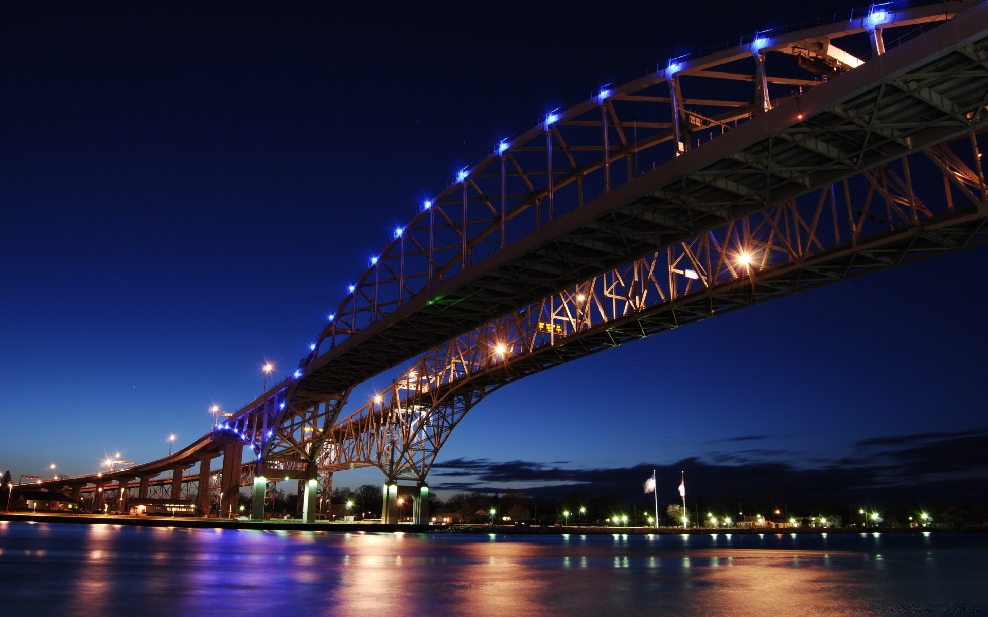 Uma ponte cheia de luzes sobre o rio para a cidade