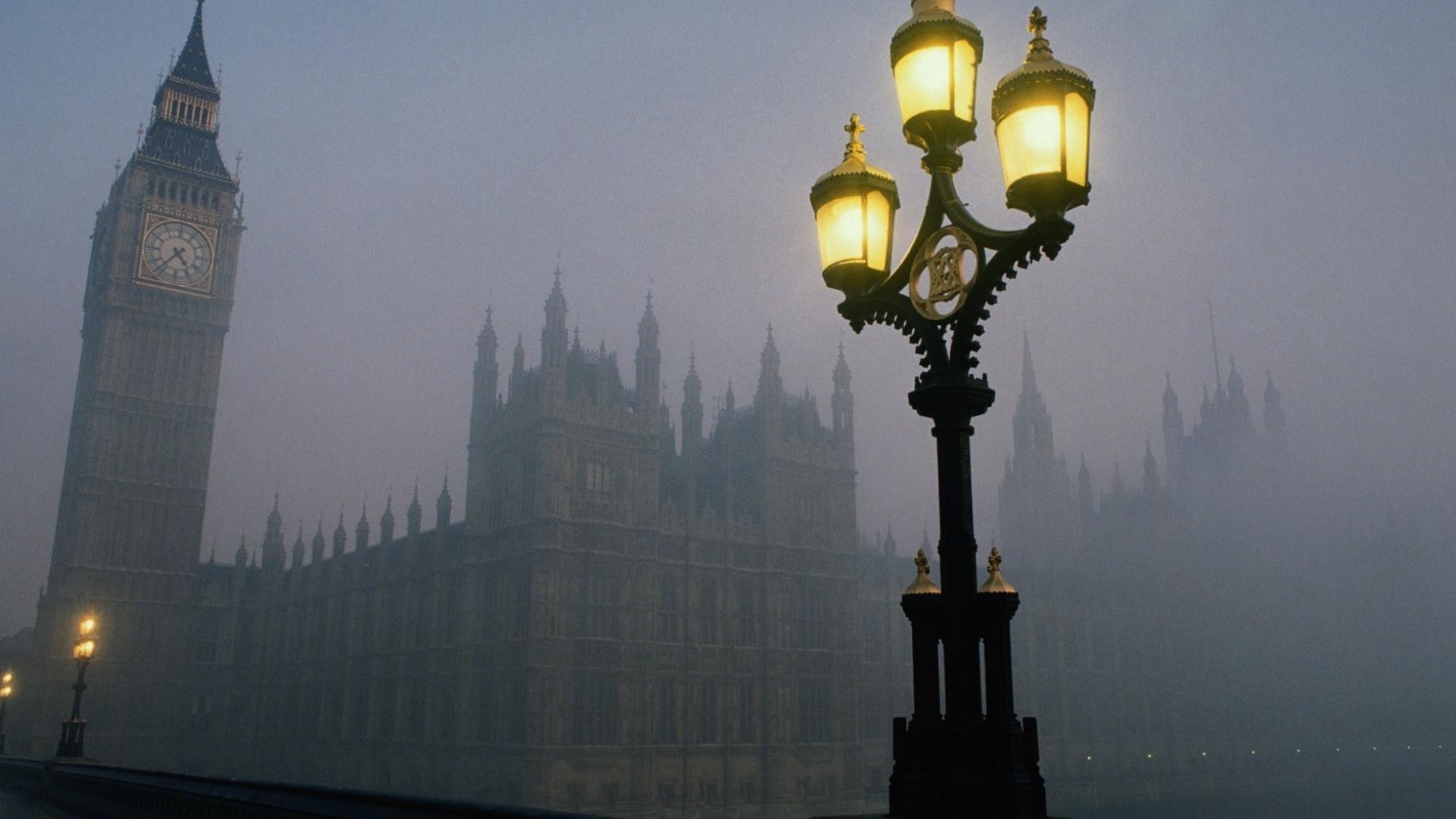Cidade enevoada de Londres e Vista Naa lâmpada de rua