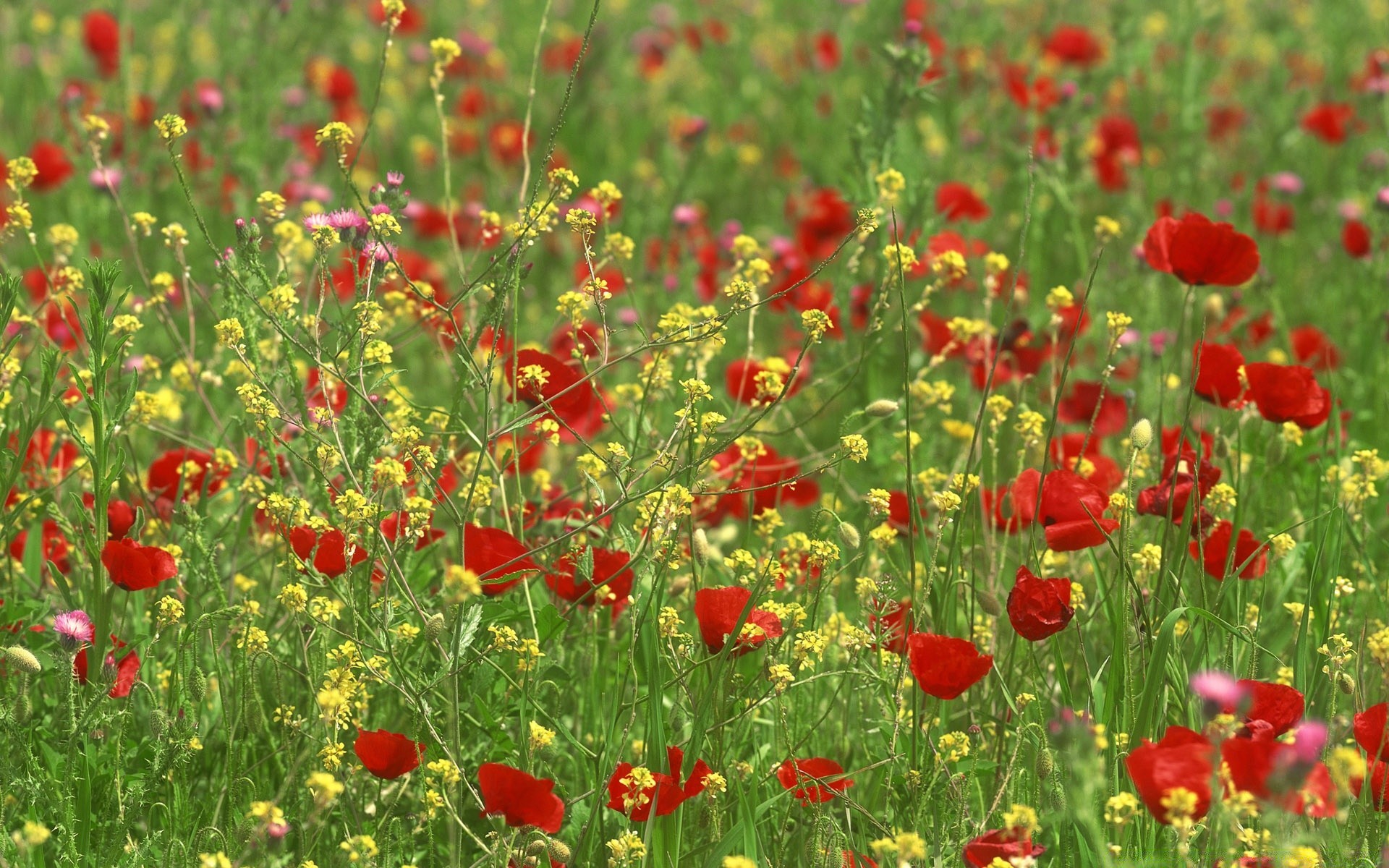 Clareira com papoulas vermelhas no fundo do pôr do sol