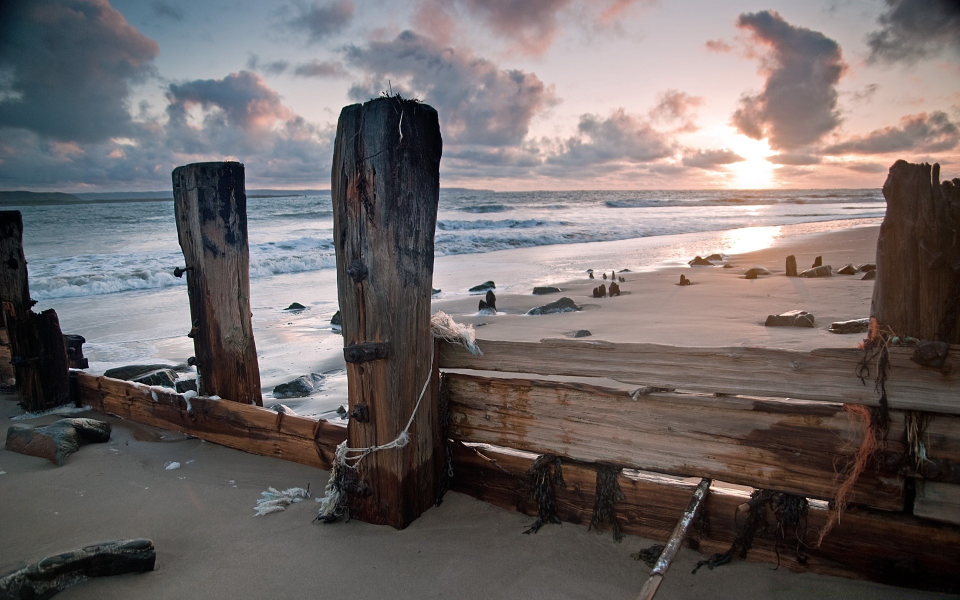 Praia de areia deserta banhada pelo mar sob um céu nublado