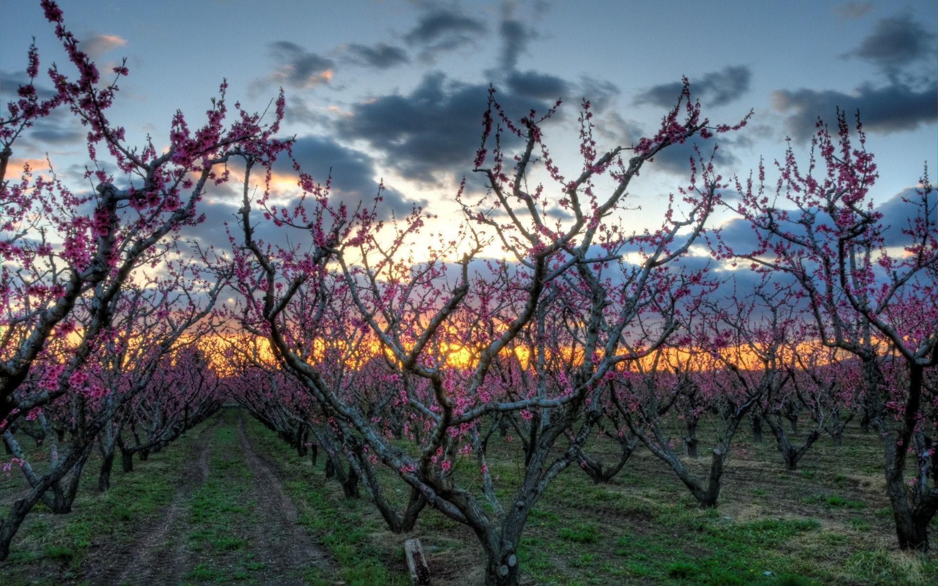 Jardim florido da primavera ao pôr do sol